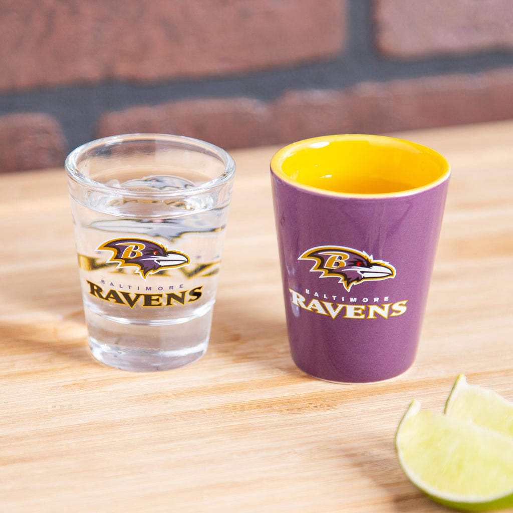 Show your team spirit with the Baltimore Ravens 4-Piece Ceramic and Glass 2oz. Cup Set, perfect for any NFL fan's collection.