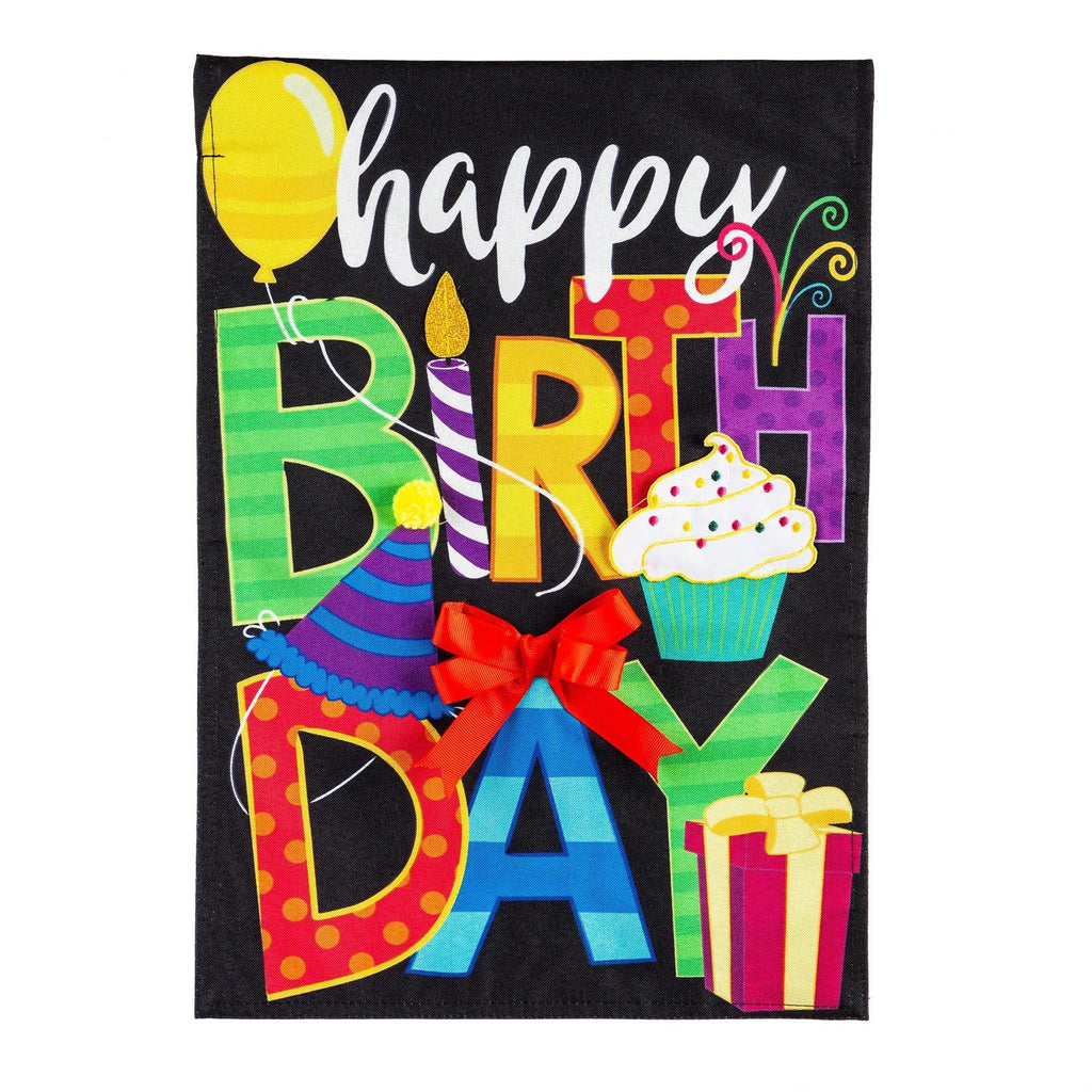 Add an extra touch of charm to any outdoor garden or yard with this burlap flag. With its adorable Happy Birthday theme, this flag welcomes friends and family in style. It’s made of medium-weight, soft burlap fabric that comes from recycled plastic. It hahas the look and feel of real burlap. Artwork is heat transferred onto both sides of the textured fabric to create a natural, crafted look. The flag is durable and weatherproof and will not fade or fray after continued display. This flag features a sleeve for use with any standard flagpole or stand, sold separately.