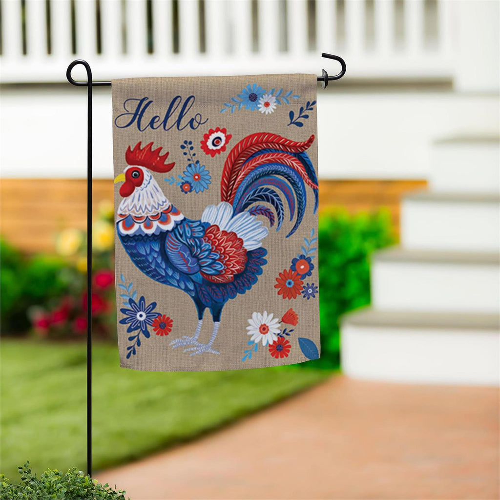 Welcome guests to your home with the vibrant RWB Rooster Burlap Garden Flag. Measuring 12.5 inches by 18 inches, this flag features a striking red, white, and blue rooster design set against a durable burlap background. Perfect for adding a touch of country charm to your garden or patio, the flag is weather-resistant, ensuring it remains bright and beautiful through the seasons. The floral accents and cheerful 'Hello' message make it an inviting decoration for any outdoor space. Enhance your garden's appeal instantly with this charming flag.