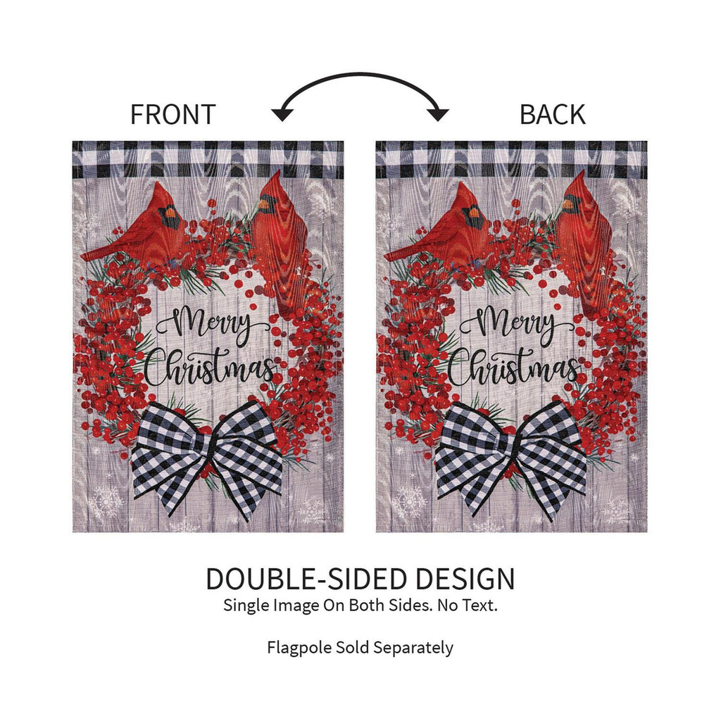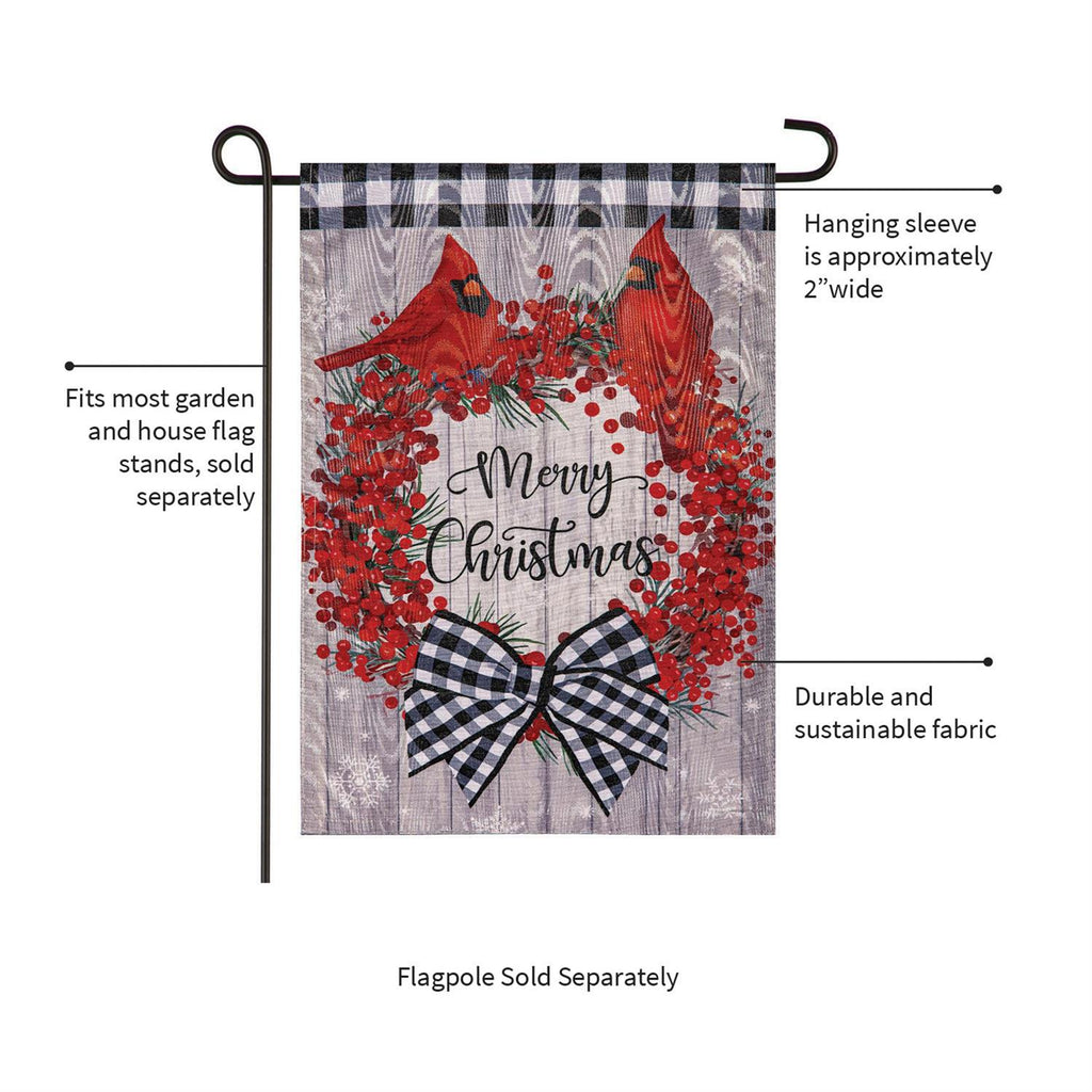 Enhance your festive outdoor décor with the Country Berry Wreath Moire Garden Flag. This charming flag features a vibrant wreath adorned with red berries and cardinals, set against a rustic wood-look background. The 'Merry Christmas' greeting adds a welcoming touch, perfect for the holiday season. Crafted from durable moire fabric, this garden flag is designed to withstand the elements while maintaining its vivid colors. Measuring 12.5 inches by 18 inches, it's the ideal size to add seasonal cheer to any garden or walkway.