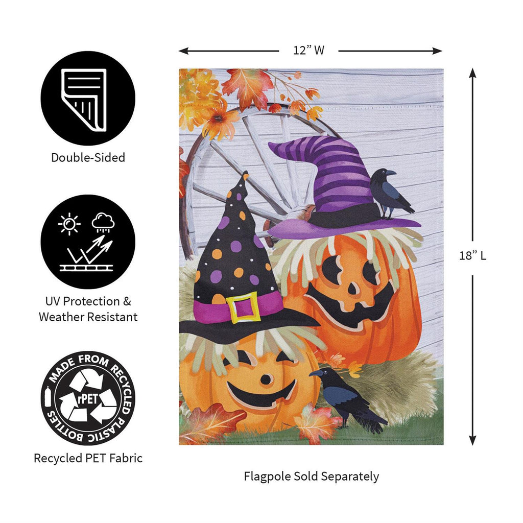 Add a festive touch to your garden with the Couple Of Jacks Pumpkin Suede Garden Flag. Perfect for the autumn season, this flag features two charming jack-o'-lanterns adorned with witch hats and surrounded by vibrant fall leaves. Crafted from durable suede, it offers a soft texture and vivid colors that will withstand the elements. Measuring 12.5 inches by 18 inches, it's designed to fit standard garden flag poles and is ideal for welcoming guests with a touch of Halloween spirit.