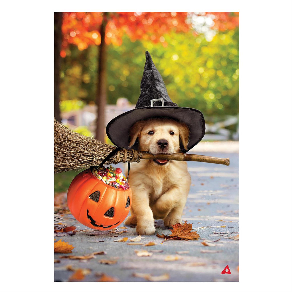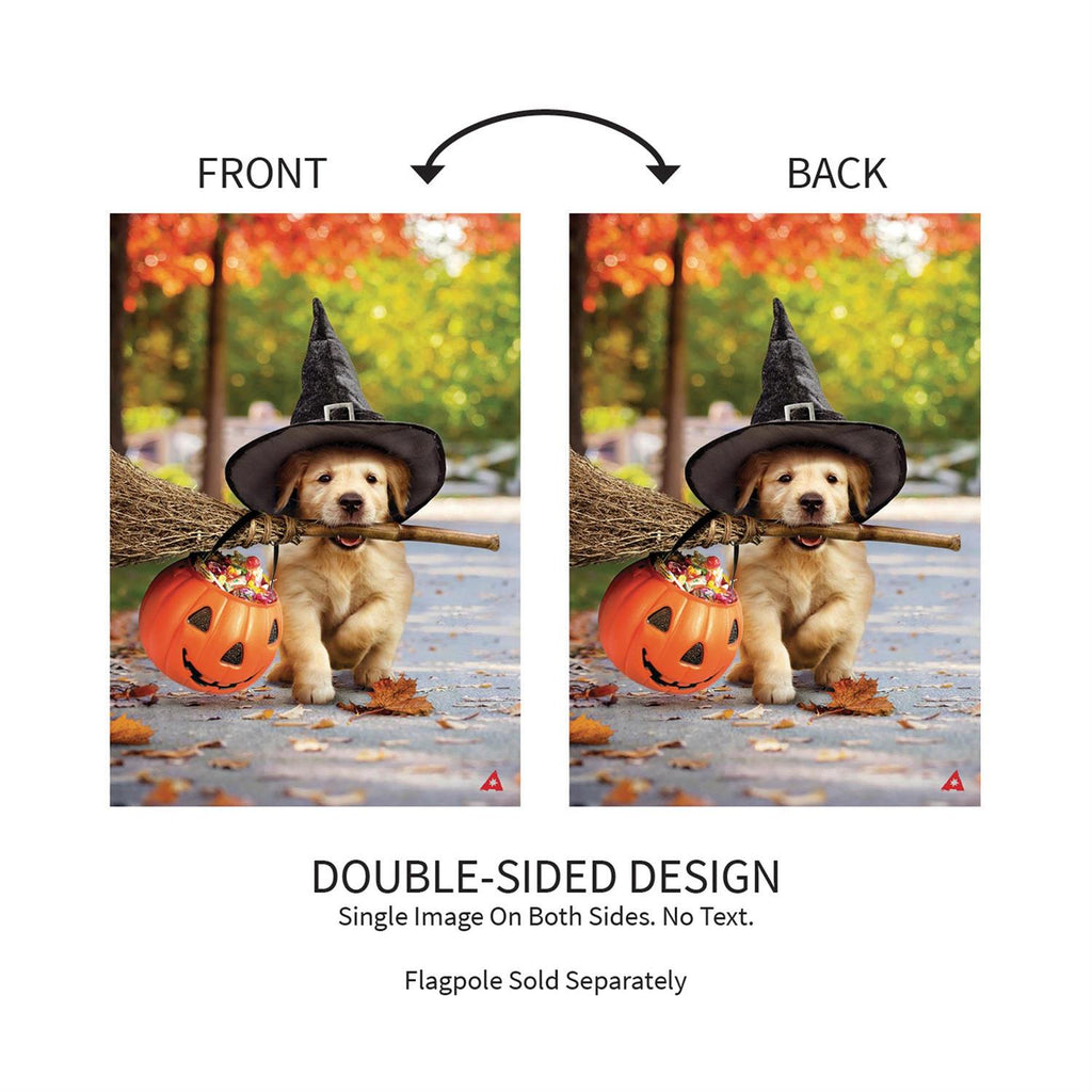 Celebrate Halloween with the charming Goldens With Broom Suede Garden Flag, perfect for adding a touch of whimsy to your outdoor space. Featuring an adorable golden retriever puppy dressed in a witch's hat, this flag captures the fun spirit of the season. Made from durable suede, it offers a rich texture and vibrant colors that withstand the elements. Measuring 12.5 x 18 inches, it's ideal for gardens, patios, or porches. Whether you're hosting a spooky gathering or just enjoying the fall season, this flag is a delightful addition to your décor.