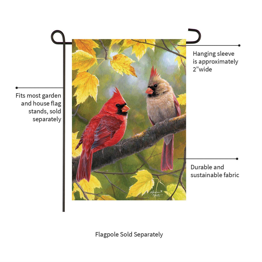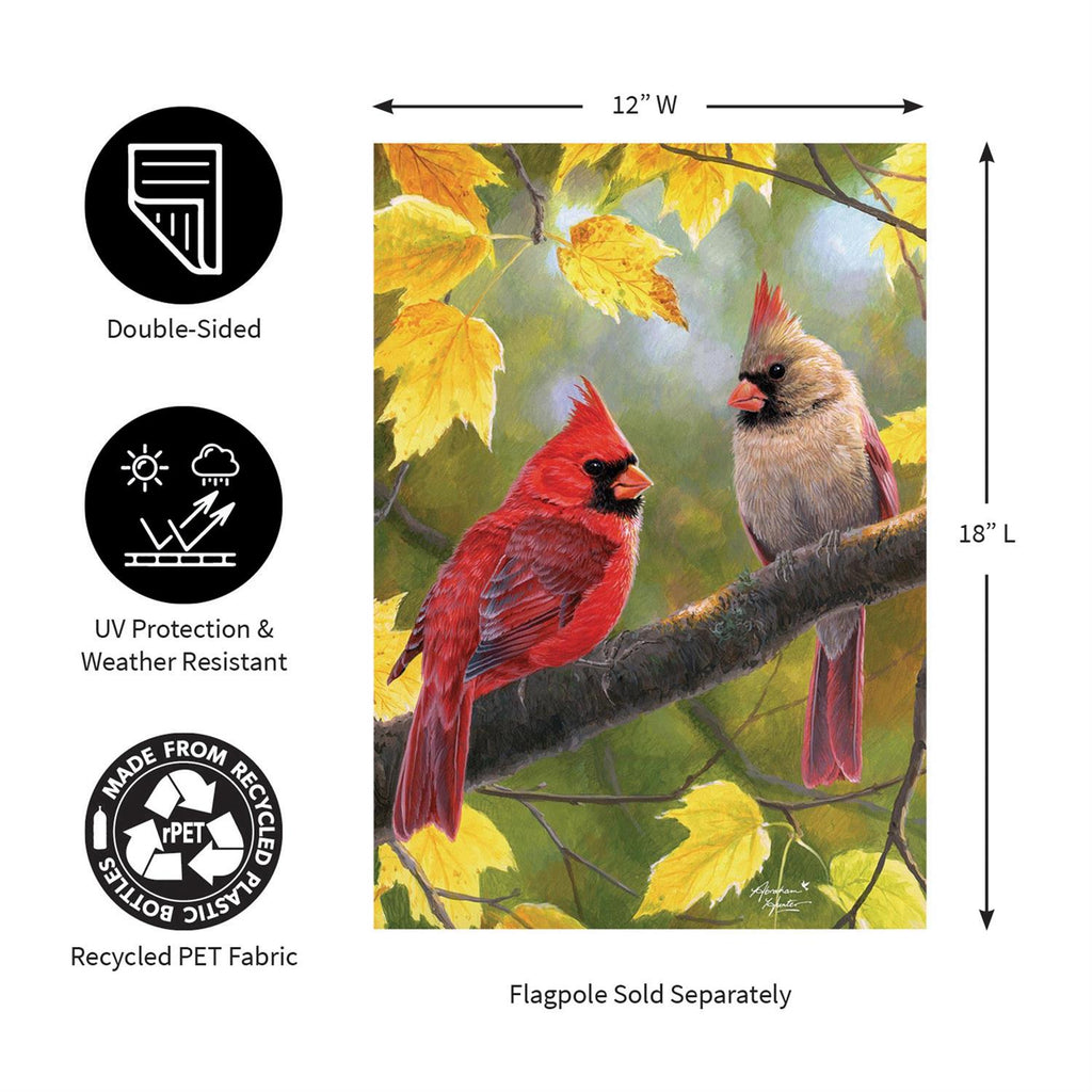 Celebrate the vibrant colors of fall with this beautiful suede garden flag featuring a charming pair of cardinals perched on a branch surrounded by golden autumn leaves. Measuring 12.5 by 18 inches, this flag is crafted from durable suede, ensuring it withstands various weather conditions while maintaining its vivid design. Ideal for adding a seasonal touch to your garden or porch, the flag's rich hues and lifelike illustration bring a touch of nature's beauty to your outdoor space. Enhance your curb appeal and welcome guests with this delightful addition to your fall décor.