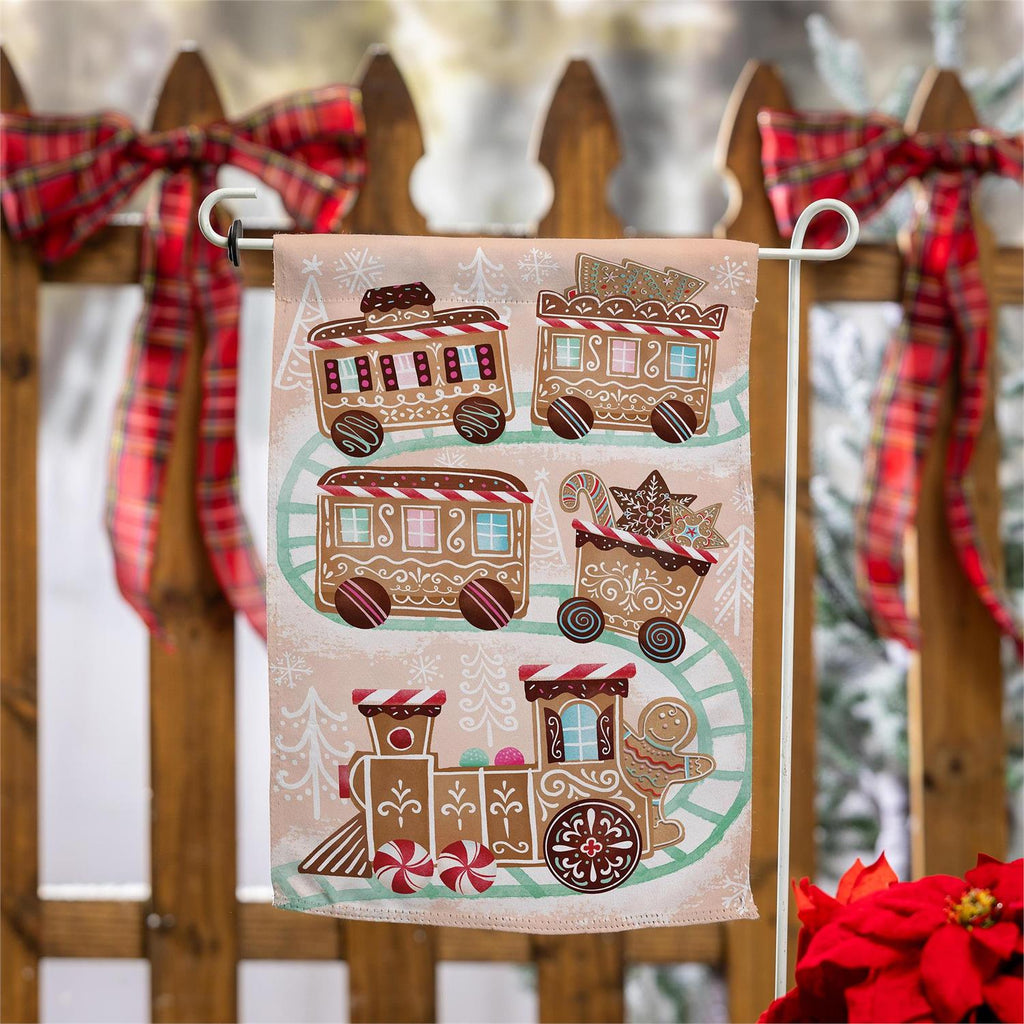 Add a touch of festive charm to your outdoor decor with the Gingerbread Train Suede Garden Flag. This delightful flag features a whimsical gingerbread train design, perfect for celebrating the holiday season. Made from durable suede, it withstands the elements while maintaining its vibrant colors. Measuring 12.5 inches wide and 18 inches high, it's the ideal size to make a cheerful statement in your garden or yard. Elevate your holiday decorations with this charming and playful garden flag.