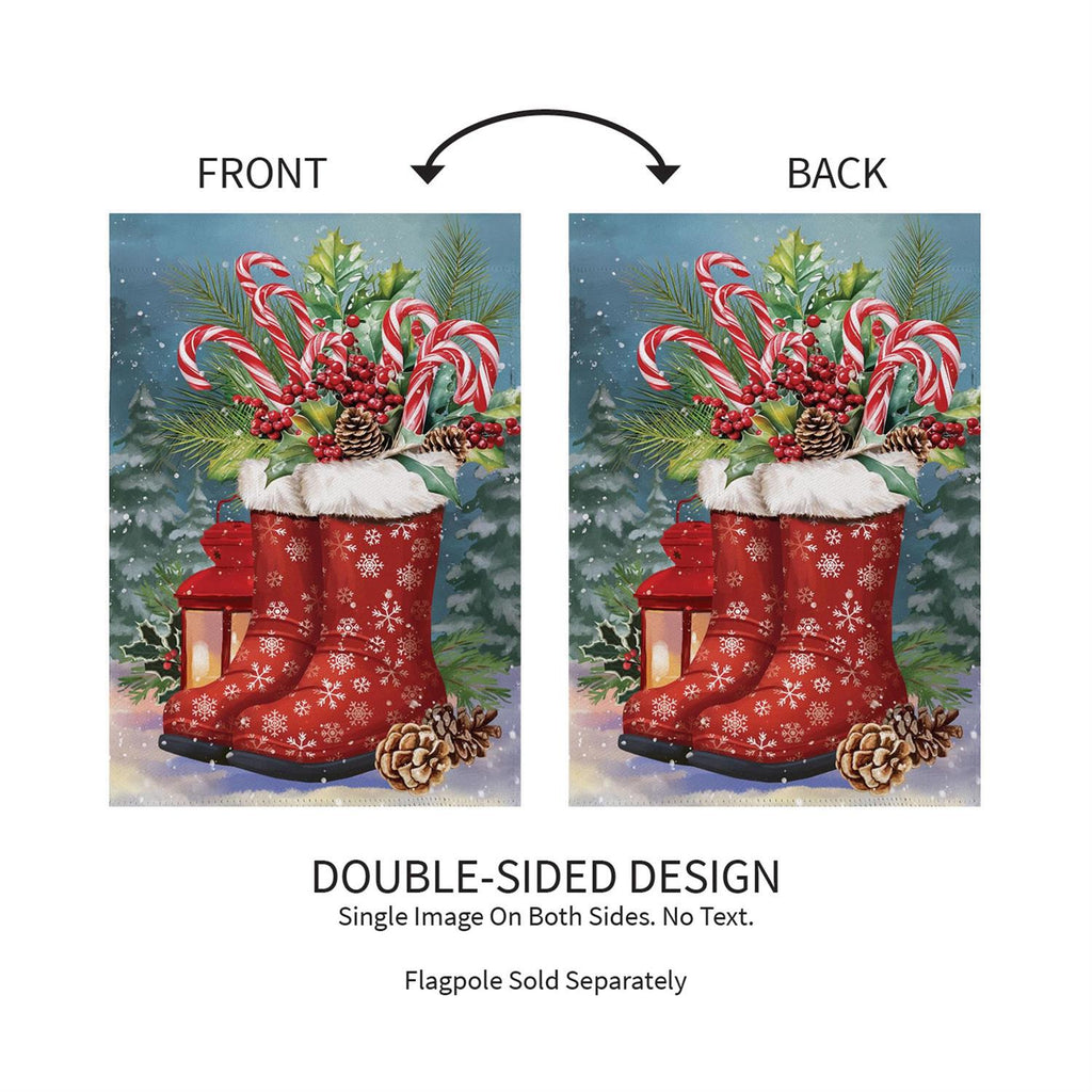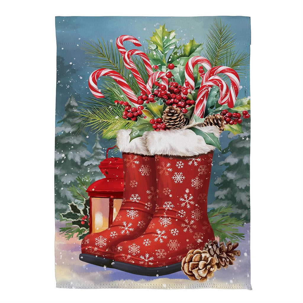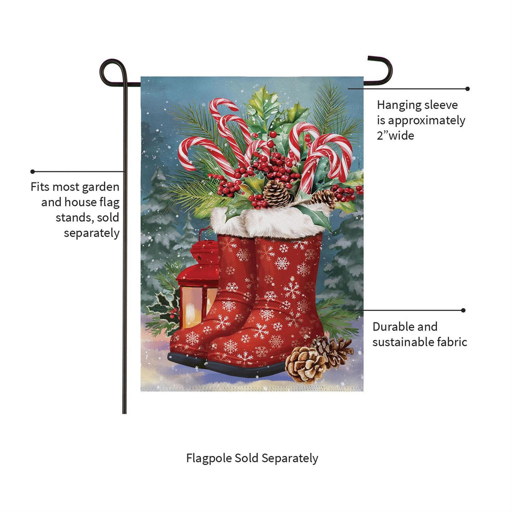 Celebrate the winter season with this charming suede garden flag featuring a delightful winter boots design. Perfect for adding a festive touch to your outdoor décor, this flag showcases vibrant red boots filled with candy canes, holly, and pinecones against a snowy backdrop. The durable suede material ensures the flag will withstand the elements while maintaining its bright, vivid colors. Ideal for gardens, porches, or patios, this flag measures 12.5 inches wide by 18 inches high, making it an eye-catching addition to any outdoor space.
