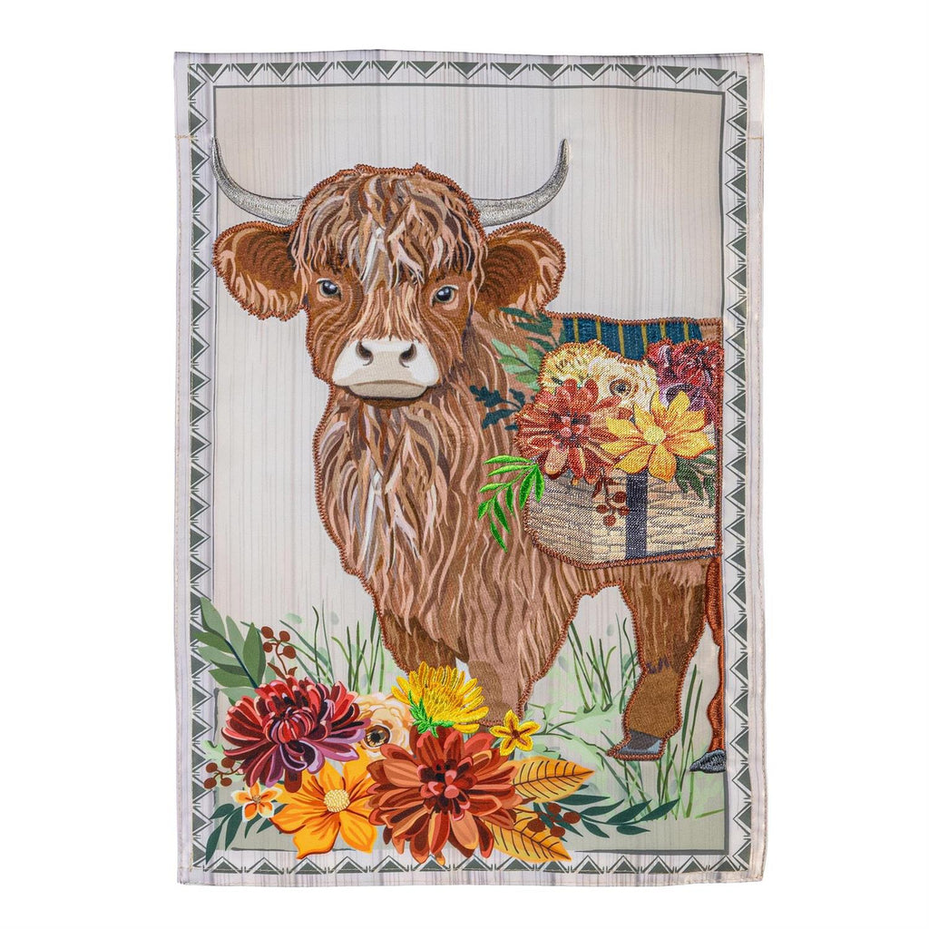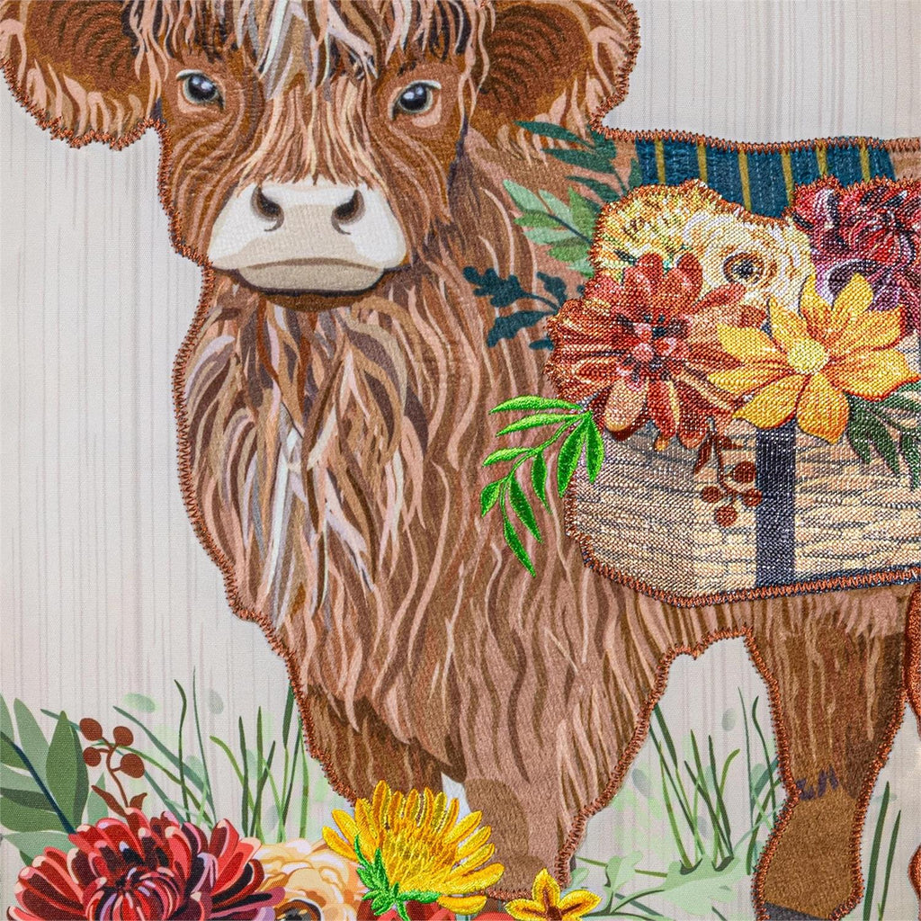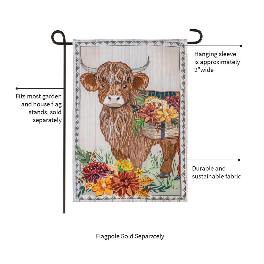 Elevate your autumn décor with the Highland Cow Fall Floral Applique Garden Flag. This charming piece features a delightful highland cow adorned with vibrant fall flowers, making it a stunning addition to any outdoor space. Crafted with intricate applique detailing, it brings texture and color to your garden, patio, or yard. Measuring 12.5 inches in width and 18 inches in height, this flag is perfect for adding a seasonal touch. Its durable fabric ensures it withstands the autumn weather while maintaining its vibrant appeal.