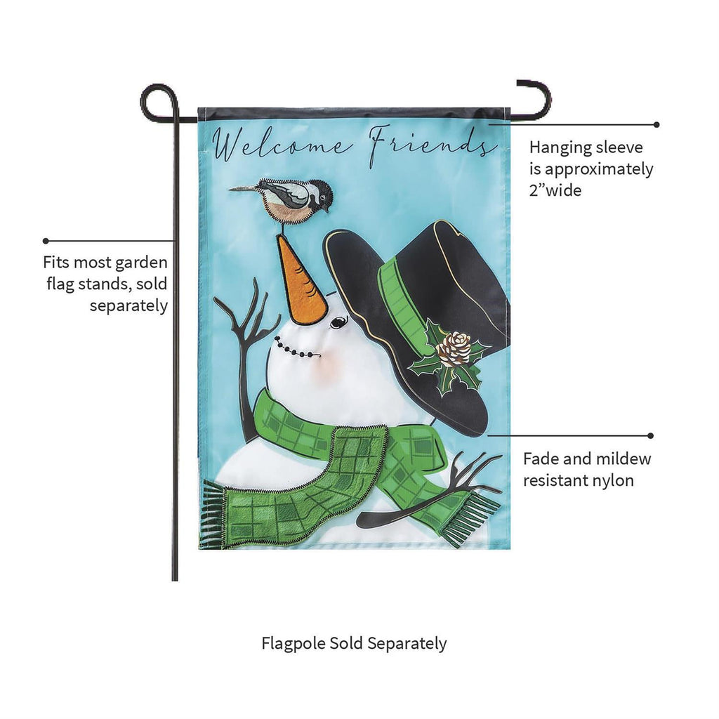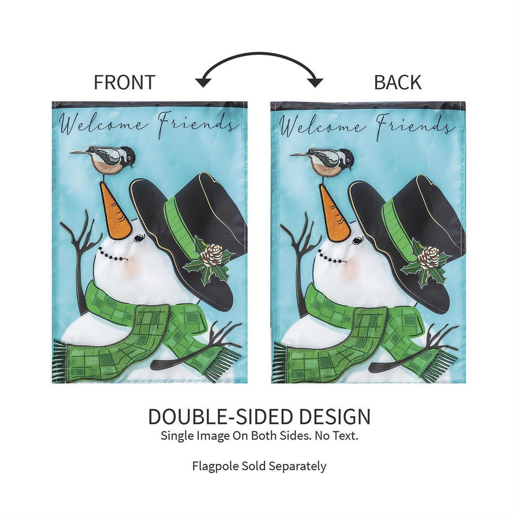 Celebrate the winter season with the charming Snowman and Chickadee Applique Garden Flag. This 18 x 12.5-inch flag features a delightful snowman adorned with a cozy green scarf and a stylish black hat, accented with a friendly chickadee perched on his carrot nose. Crafted with attention to detail, this applique flag offers vibrant colors and a welcoming message, making it a perfect addition to your garden or entryway. The double-sided design ensures the image is visible from both sides, enhancing the festive spirit of your outdoor space.