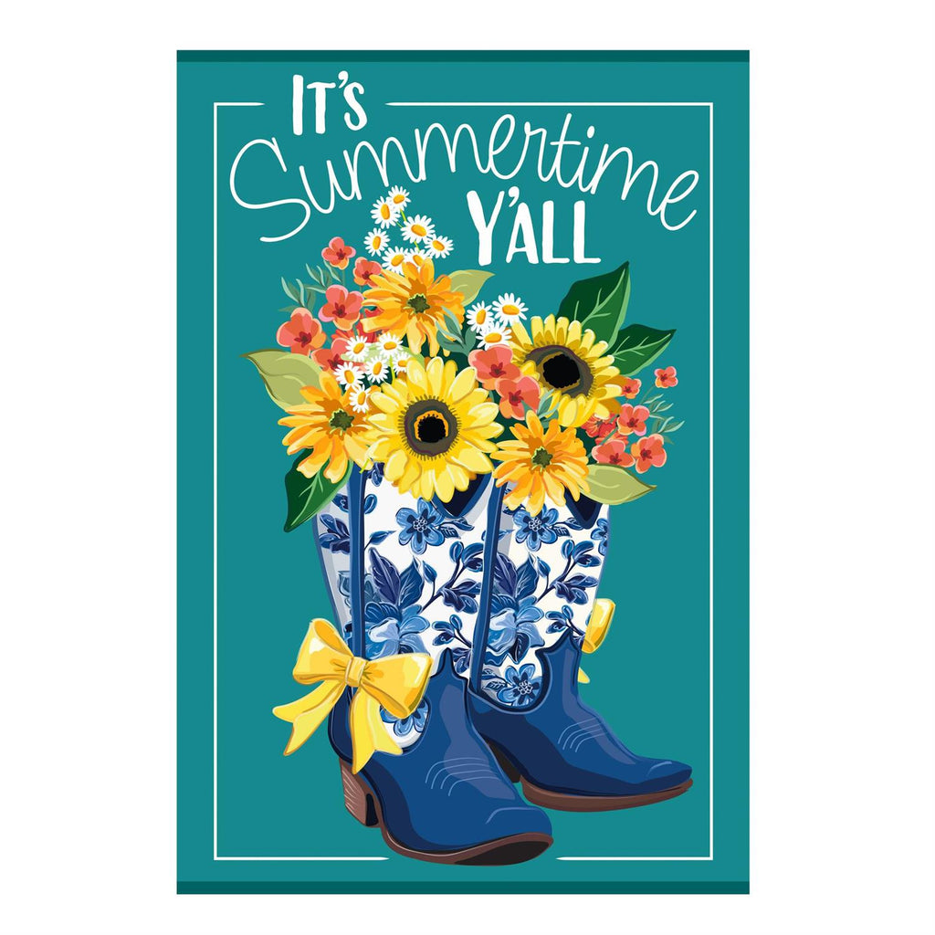 Introduce a touch of Southern charm to your garden with the Chinoiserie Cowboy Boots & Bows Applique Garden Flag. This eye-catching flag features vibrant sunflowers and floral patterns nestled in decorative cowboy boots, complete with cheerful yellow bows. The phrase 'It's Summertime Y'all' adds a welcoming touch to any outdoor space. Made from durable materials, this flag is perfect for brightening up your garden during the summer months. Easy to hang and maintain, it offers a delightful way to celebrate the season.