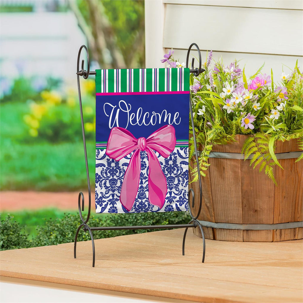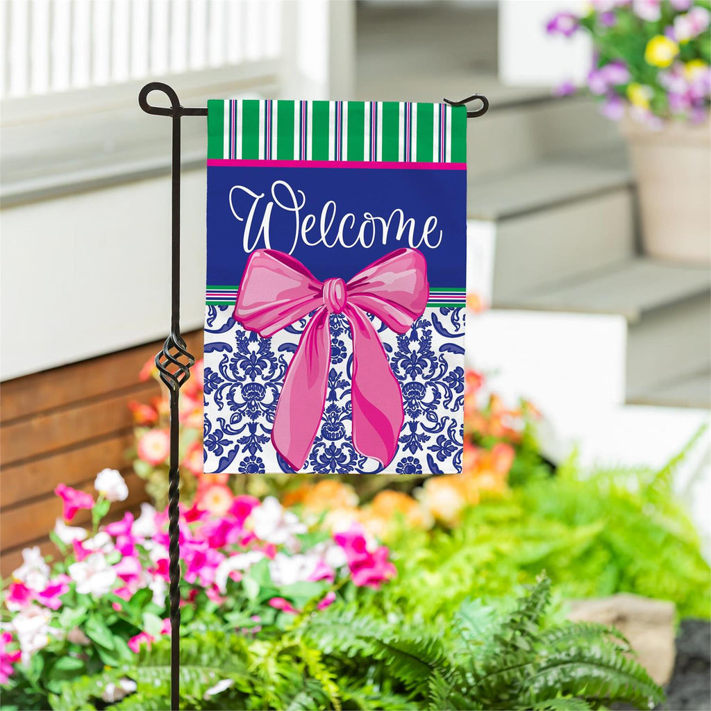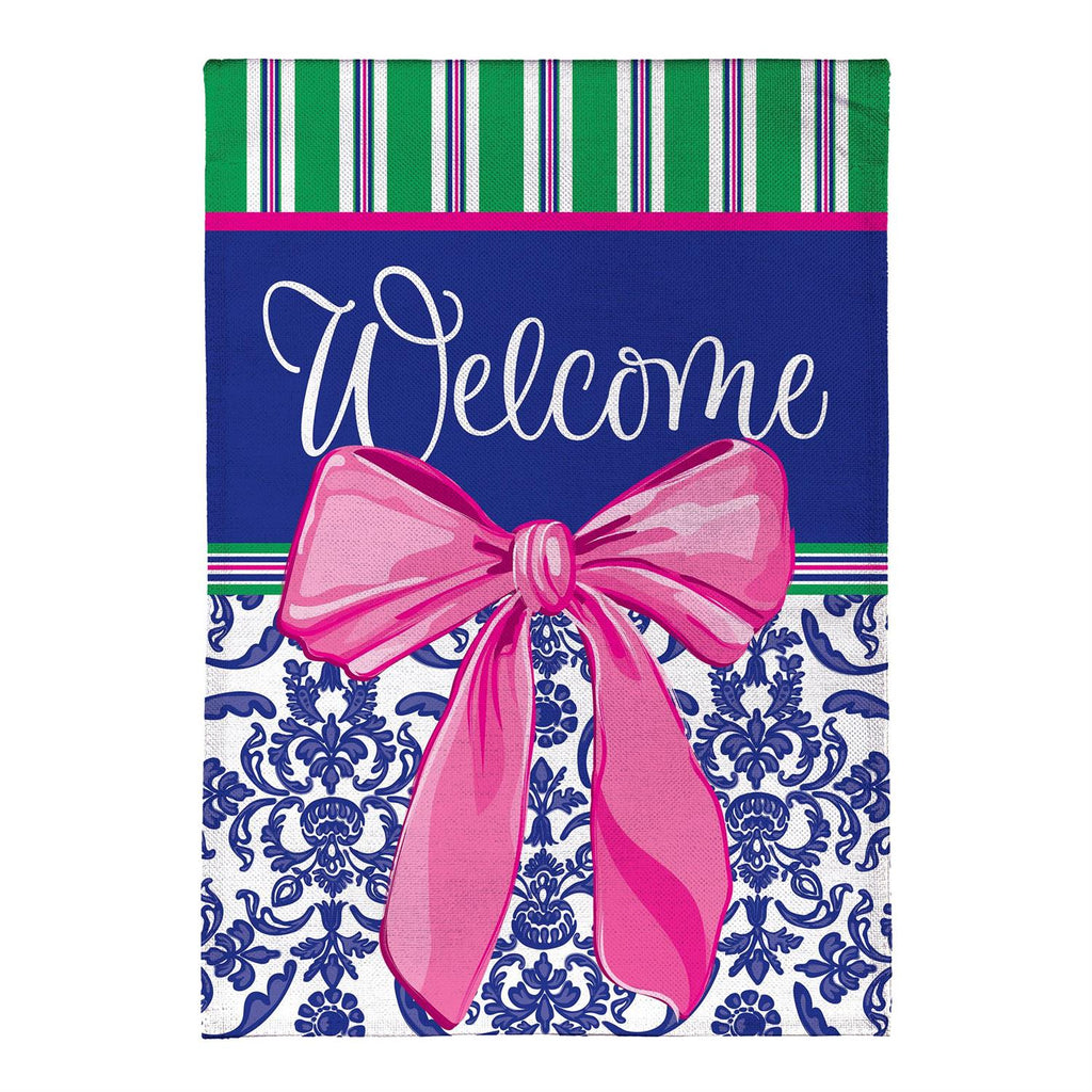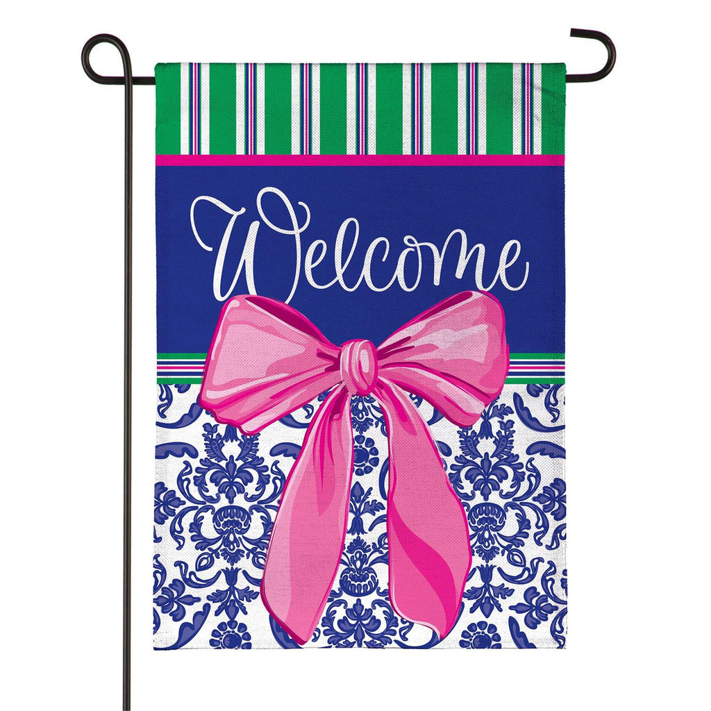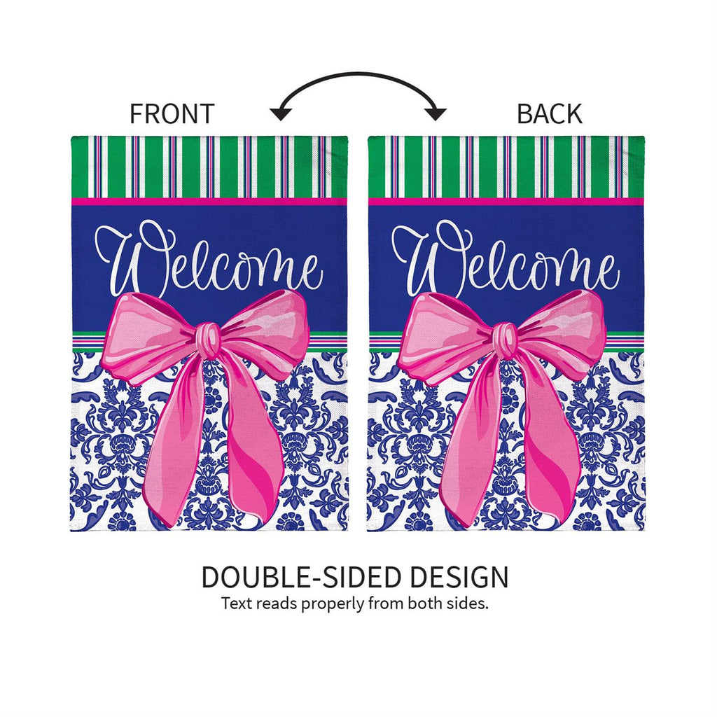 Welcome guests in style with this charming Chinoiserie burlap garden flag. Featuring a vibrant design with a bold pink bow and elegant patterns, this flag adds a touch of sophistication to any outdoor space. Crafted from durable burlap, it withstands the elements while retaining its vivid colors. Measuring 18 inches in length and 12.5 inches in width, it's the perfect size to make a statement without overwhelming your garden. Whether it's spring or summer, this flag is a delightful way to enhance your home's curb appeal.