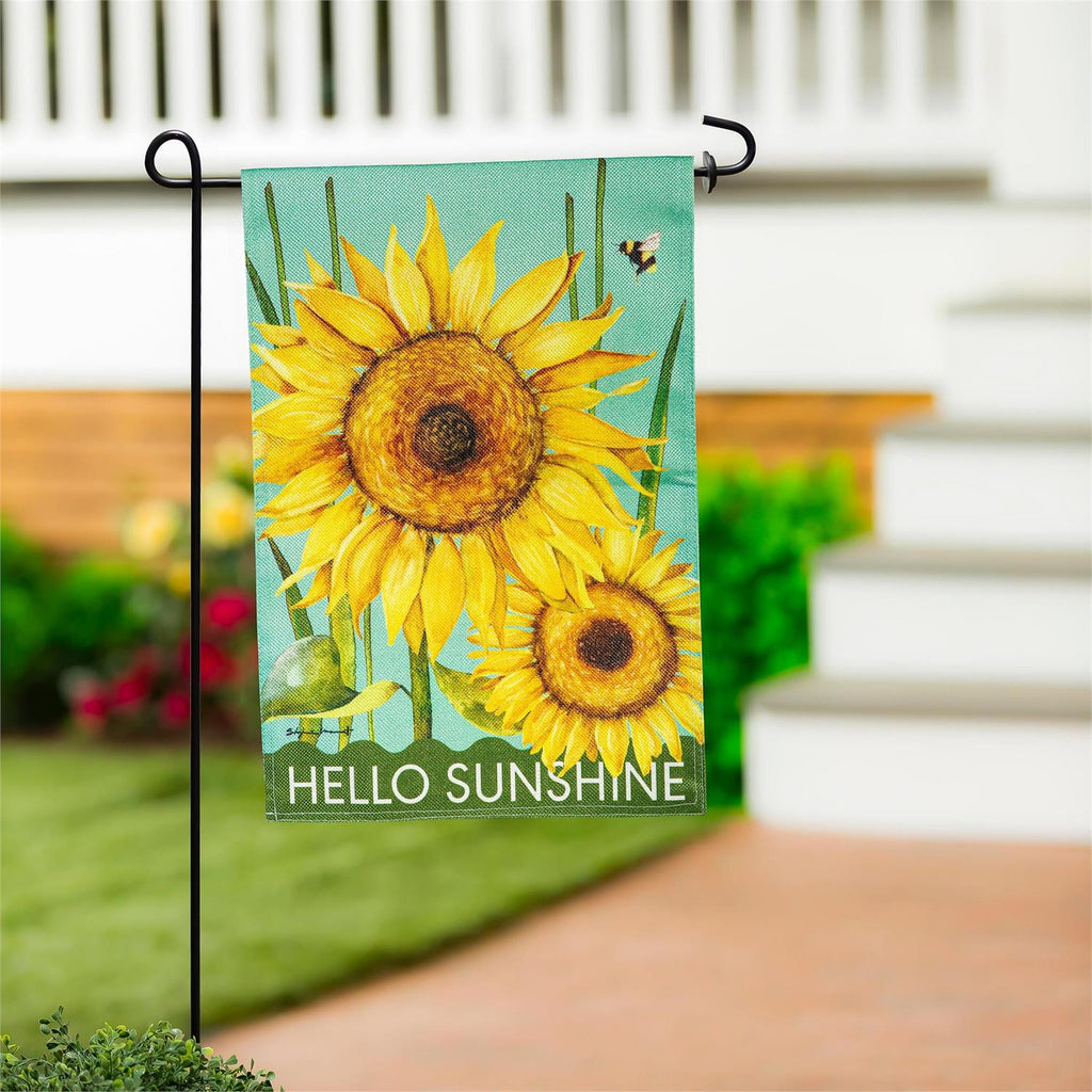 Brighten your garden or front yard with the vibrant 'Hello Sunshine' Burlap Garden Flag. Featuring a cheerful sunflower design with a friendly bee, this flag is made from durable burlap material, ideal for any season. Perfectly sized at 18" x 12.5", it fits most garden flag stands, making it an easy and delightful addition to your outdoor décor. Welcome guests and celebrate sunny days with this eye-catching accent that adds warmth and charm to any outdoor setting.
