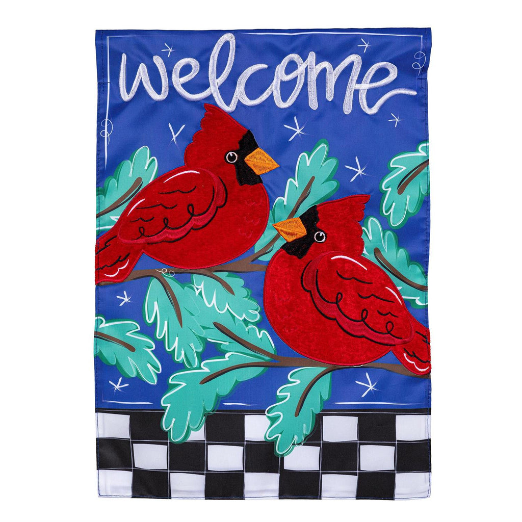 Enhance your outdoor décor with the Welcome Winter Friends Applique Garden Flag, a charming addition perfect for the winter season. Featuring vibrant red cardinals perched on lush greenery, this flag brings a touch of nature's beauty to any garden or entryway. The welcoming script and the checkered border add a playful yet elegant touch, making it a delightful sight for guests. Crafted from high-quality, weather-resistant fabric, it ensures durability throughout the winter months. Measuring 12.5 inches by 18 inches, this flag is ideal for creating a cozy, festive atmosphere.