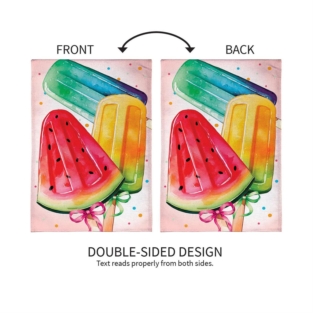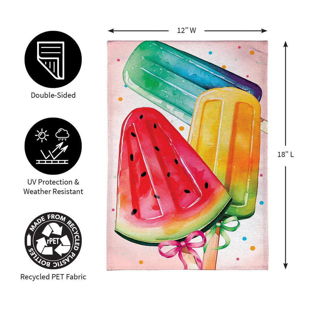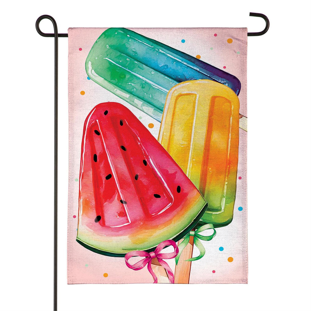 Add a splash of summer fun to your garden with the Summer Treats Burlap Garden Flag. Featuring vibrant popsicle and watermelon designs, this flag captures the essence of warm, sunny days. Made from durable burlap, it withstands outdoor conditions while adding a whimsical touch to your yard or garden. Measuring 18 inches by 12.5 inches, it fits standard garden flag stands. Perfect for welcoming guests to your home with a cheerful, seasonal flair.