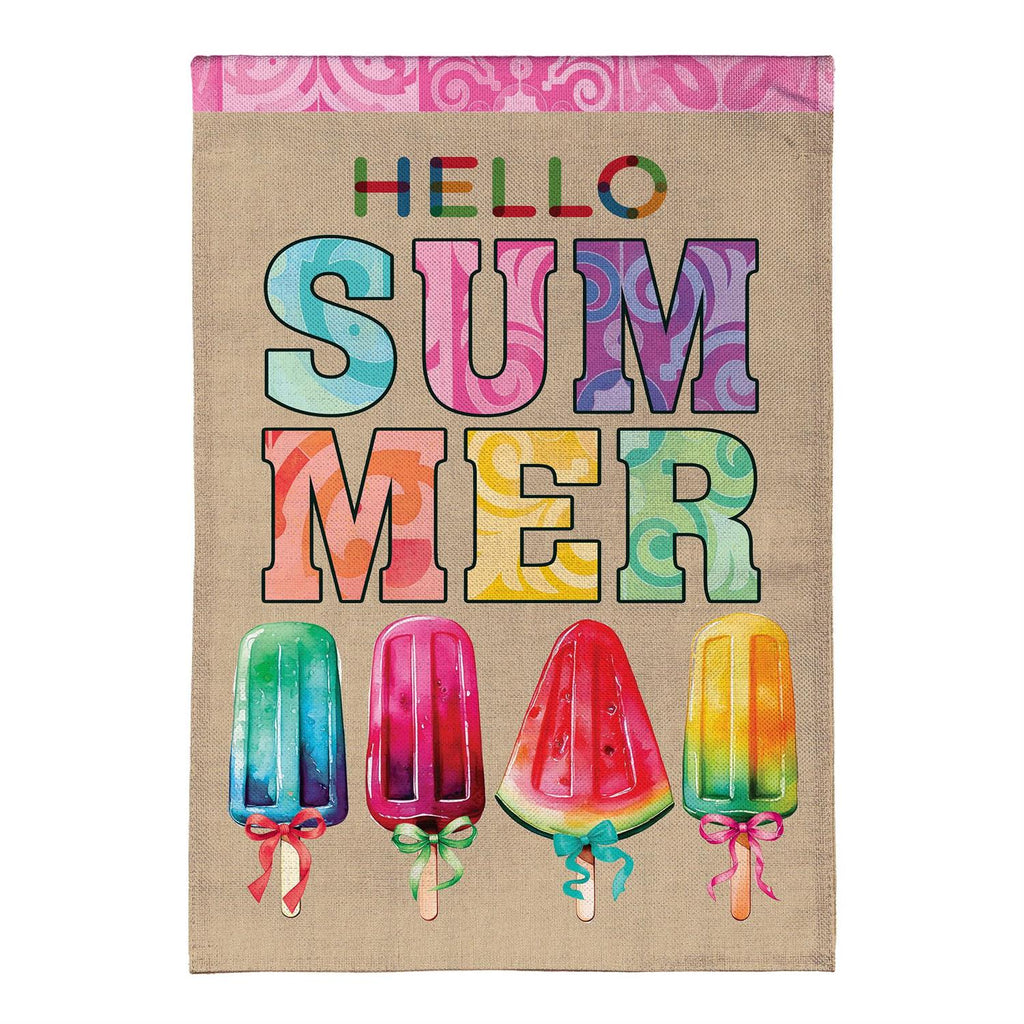 Welcome the warm season with the vibrant Summer Popsicle Burlap Garden Flag. Perfect for adding a splash of color to your outdoor space, this flag features a delightful array of popsicles and cheerful lettering that reads 'Hello Summer.' Made from high-quality burlap, it promises durability and a charming rustic look. Measuring 18 x 12.5 inches, its compact size makes it ideal for any garden, patio, or backyard. The flag is easy to install and will make a charming addition to your seasonal décor.