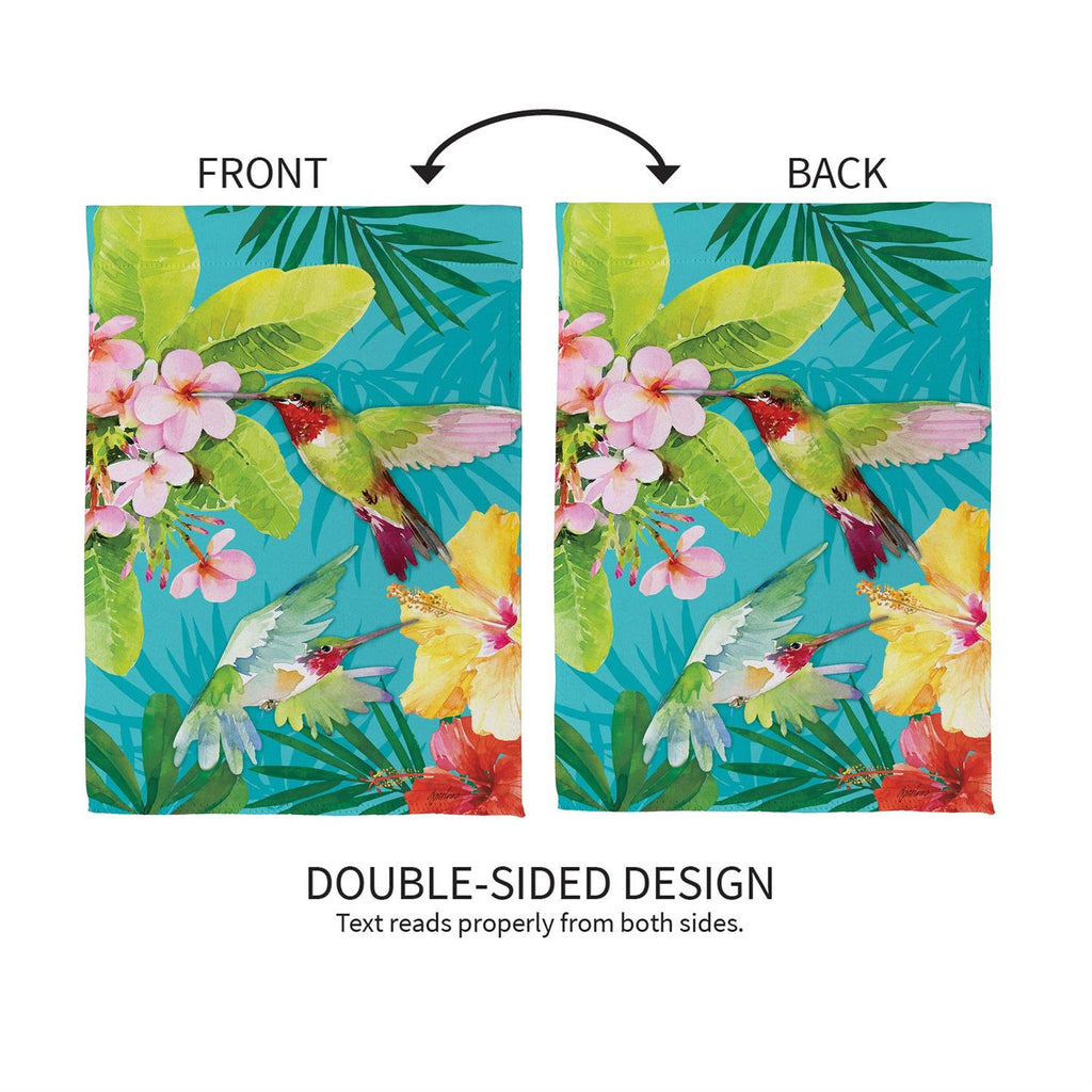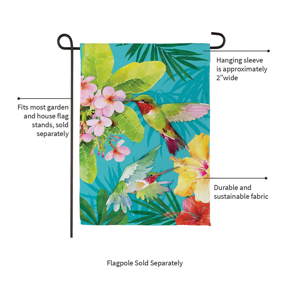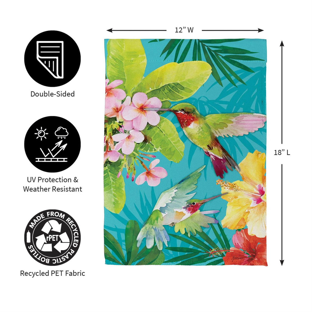 Transform your garden into a tropical oasis with the Paradise Birds Suede Garden Flag. Measuring 18.0 x 12.5 inches, this vibrant flag features a stunning array of colorful birds and lush flowers against a bright blue background. Made from durable suede, it offers a soft texture and long-lasting vibrancy. Perfect for adding a splash of color to your outdoor space, this flag is ideal for spring and summer displays. Easy to hang, it is sure to enhance the beauty of any garden, yard, or patio.
