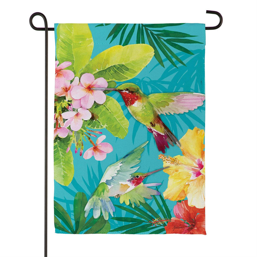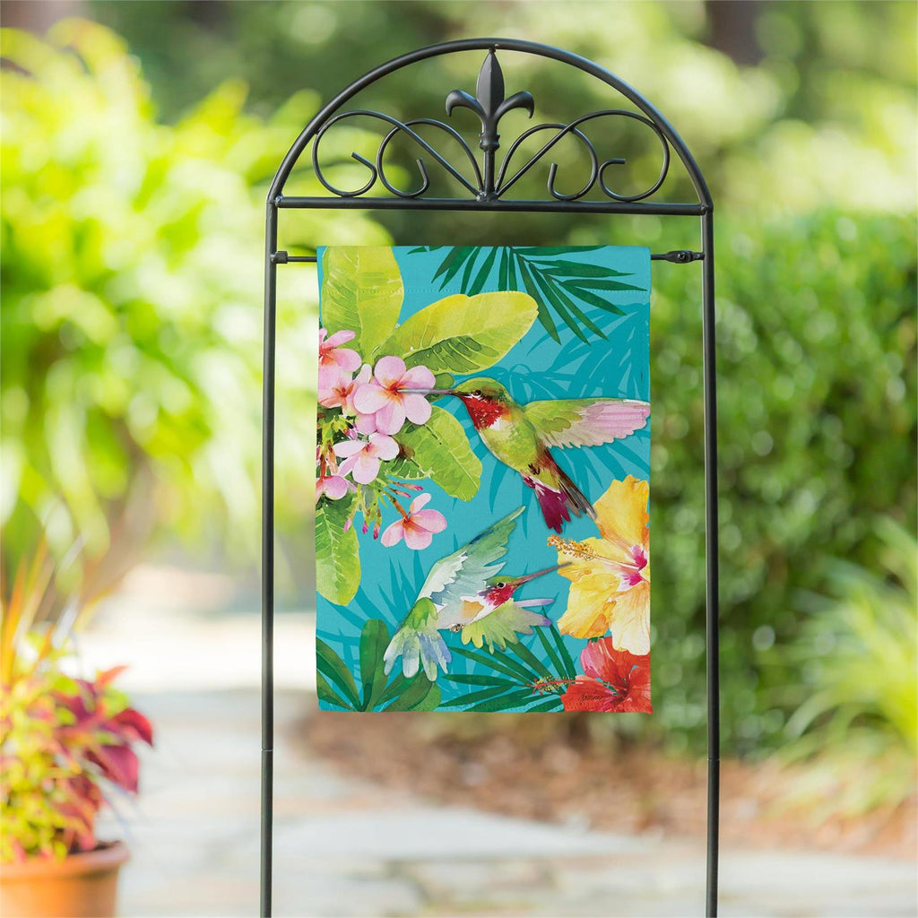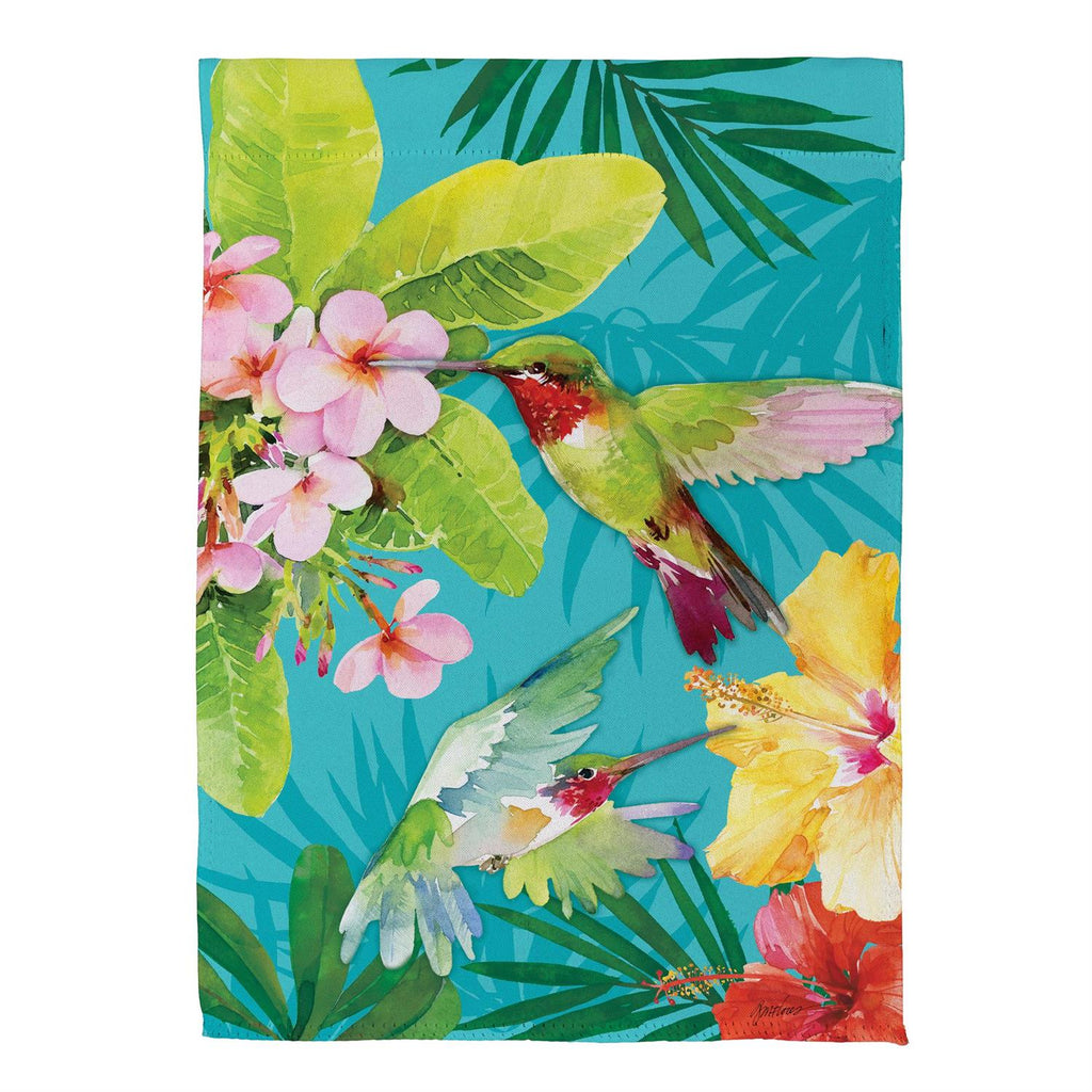 Transform your garden into a tropical oasis with the Paradise Birds Suede Garden Flag. Measuring 18.0 x 12.5 inches, this vibrant flag features a stunning array of colorful birds and lush flowers against a bright blue background. Made from durable suede, it offers a soft texture and long-lasting vibrancy. Perfect for adding a splash of color to your outdoor space, this flag is ideal for spring and summer displays. Easy to hang, it is sure to enhance the beauty of any garden, yard, or patio.