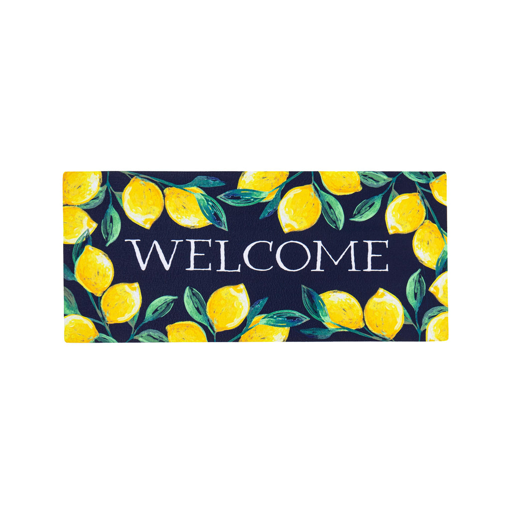 Brighten your doorstep with the Coastal Citrus Lemons Sassafras Switch Mat, featuring a vibrant lemon design and a welcoming message.