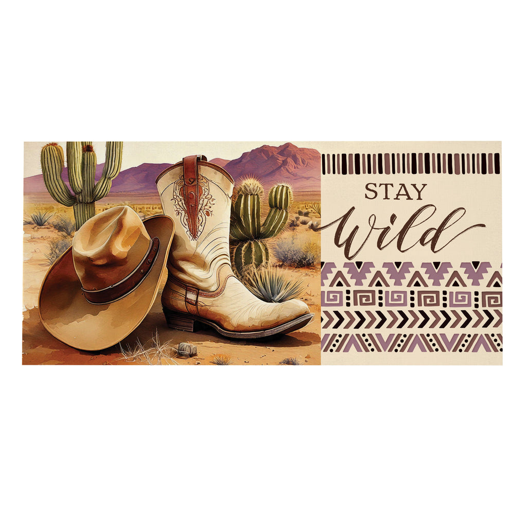 Embrace the spirit of the Wild West with this vibrant Sassafras Switch Mat, perfect for adding a rustic charm to your home's entrance. The design features classic cowboy boots and a hat set against a desert backdrop.