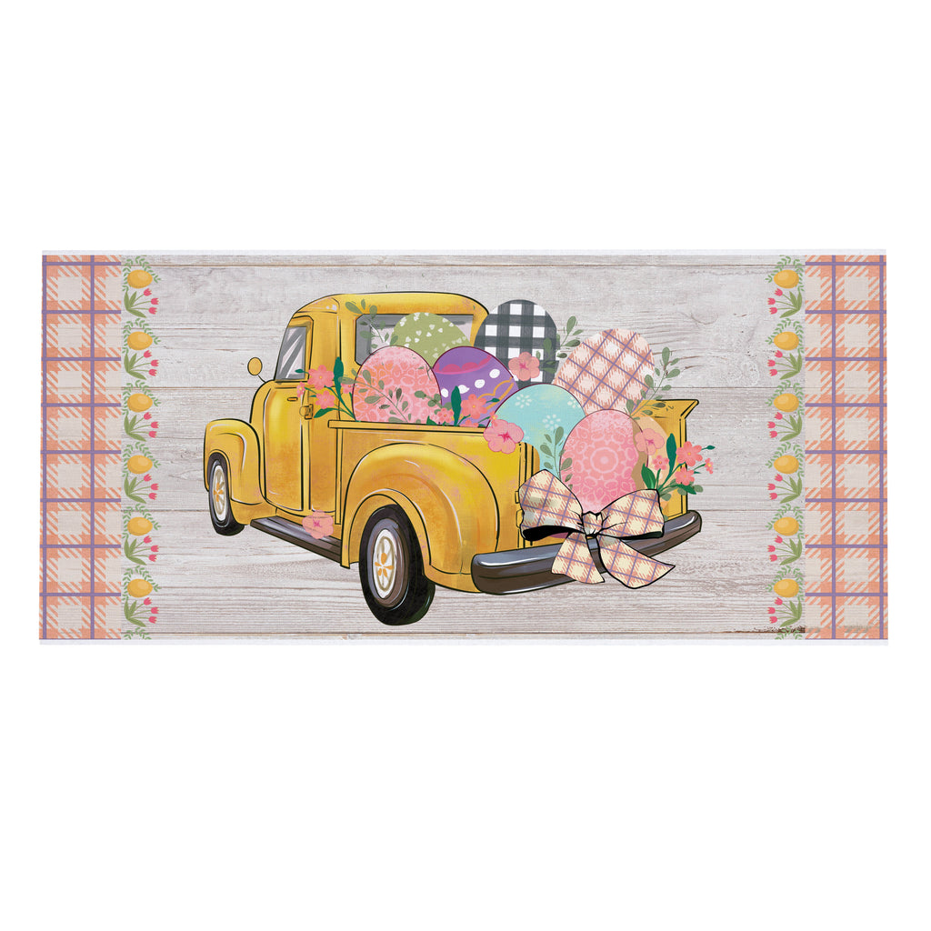 Celebrate the spring season with this charming Yellow Easter Truck Sassafras Switch Mat. Featuring a vintage truck filled with colorful eggs, it's perfect for adding a festive touch to your entryway.