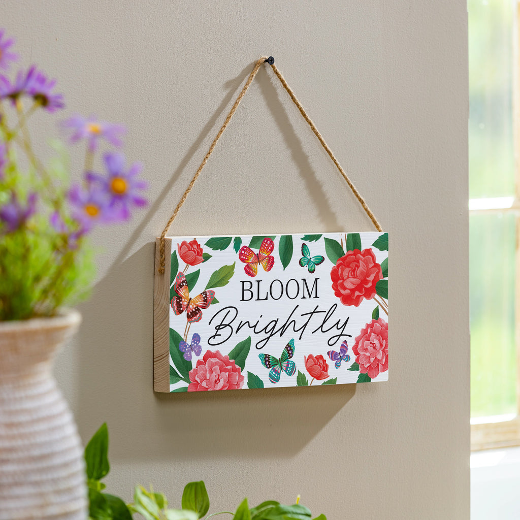 Brighten any room with this charming peony toile wood hanging sign featuring vibrant butterflies and a motivational 'Bloom Brightly' message. Perfect for adding a touch of garden-inspired elegance to your indoor decor.
