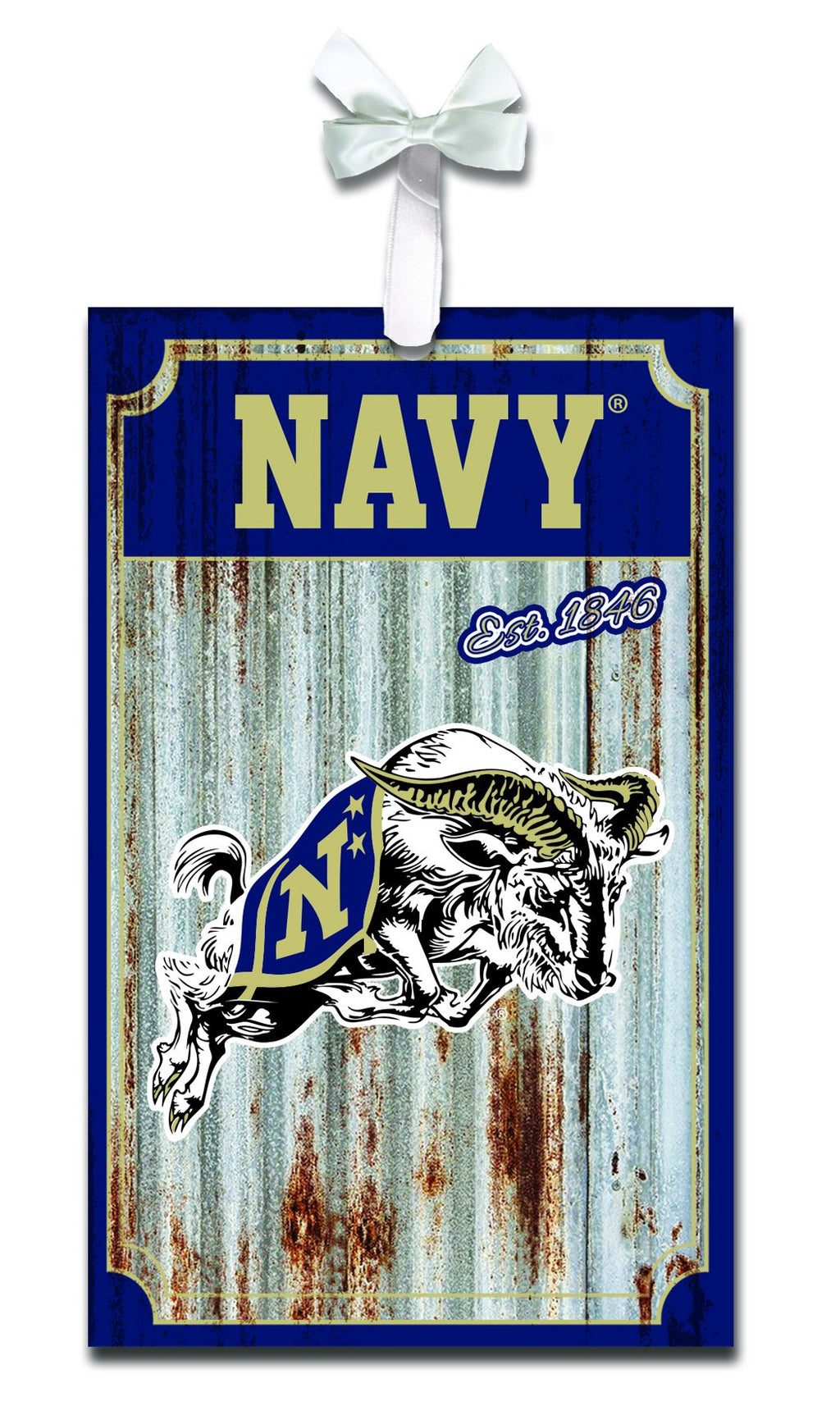 Celebrate your pride for the US Naval Academy with this striking metal corrugate ornament. Featuring a rugged corrugated metal design, it highlights the iconic Navy logo and mascot, making it a perfect addition to your holiday décor or everyday display. The ornament measures 5 inches in length, 3.25 inches in width, and 0.5 inches in height, allowing it to fit seamlessly into any space. Whether you’re a military enthusiast or an alumni, this ornament serves as a meaningful keepsake.