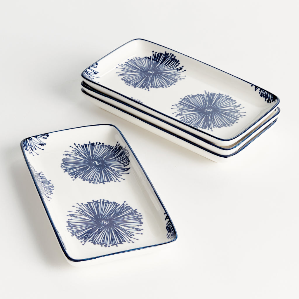 Set the table with a modern composition in blue. This set of 4 petite stoneware trays is made of dishwasher and microwave safe porcelain. Simply perfect for olives, pickles or any little culinary accoutrements.