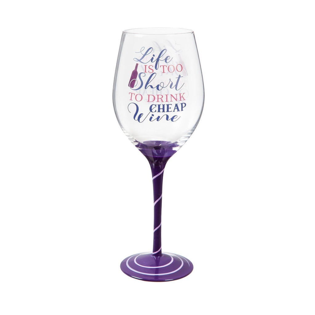 Enhance your wine-drinking experience with this stylish 17 oz. wine glass, featuring the playful message 'Life is Too Short to Drink Cheap Wine.' Perfect for wine lovers with a sense of humor, this glass offers a generous capacity for savoring your favorite vintages. The vibrant design in purple and pink adds a pop of color, while the matching gift box makes it an ideal present for any occasion. Whether you're hosting a dinner party or enjoying a cozy night in, this wine glass is sure to impress.