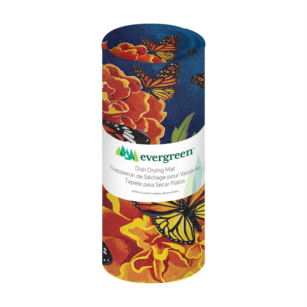 Elevate your kitchen decor with the Mariposa Melody Fabric Dish Drying Mat. Measuring 20" x 15", this mat offers ample space for drying dishes while adding a vibrant touch to your countertop. The beautiful butterfly and floral design brings a touch of nature indoors, making dish drying a delightful task. Crafted from absorbent fabric, it efficiently soaks up water, keeping your surfaces dry and tidy. Perfect for everyday use, this mat is a practical and stylish addition to any kitchen.