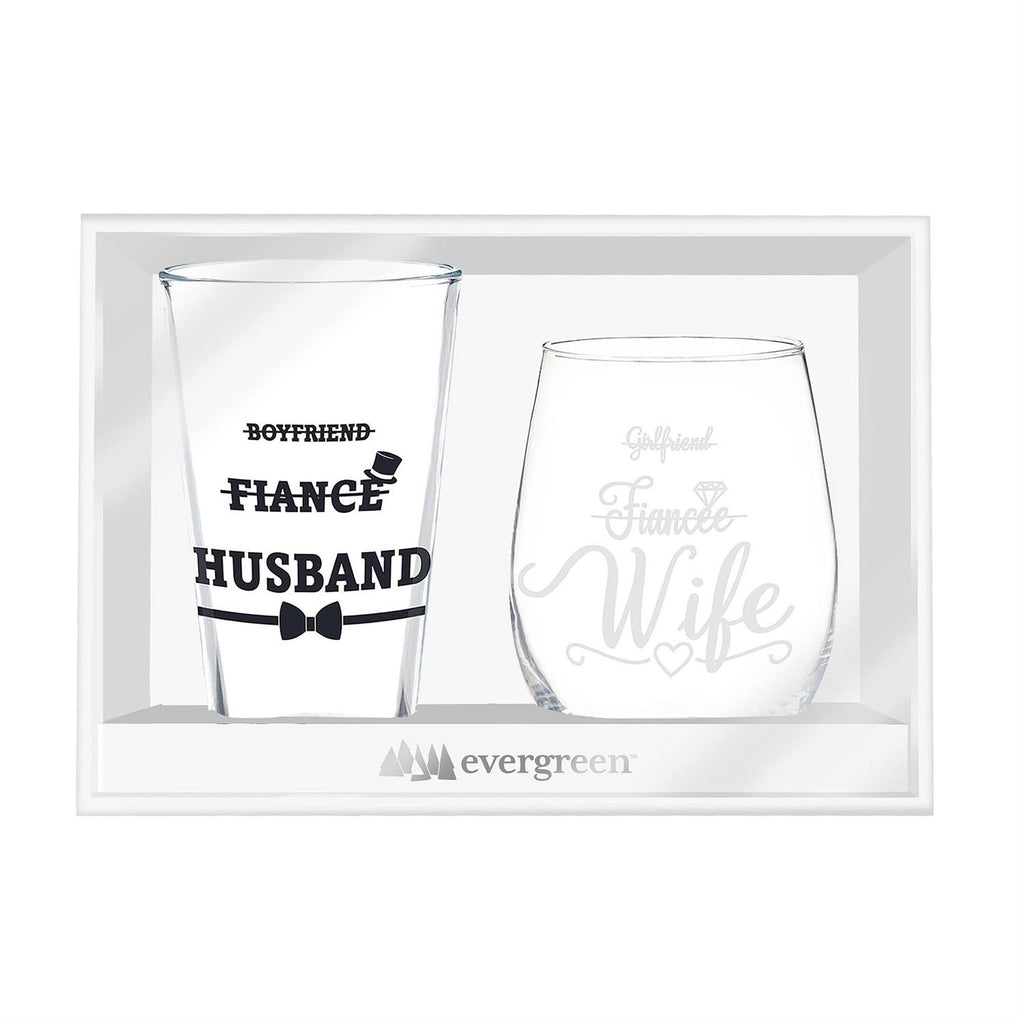 Celebrate the happy couple with this thoughtfully curated wedding glassware set, featuring a 17 oz. stemless wine glass and a 16 oz. pint glass. Perfectly paired and beautifully packaged in a ready-to-gift box, this duo is ideal for toasting to love, laughter, and happily ever after. Whether it's for a bridal shower, engagement party, or wedding day, this set blends elegance and practicality, offering one glass for wine, one for beer, and plenty of charm for both.