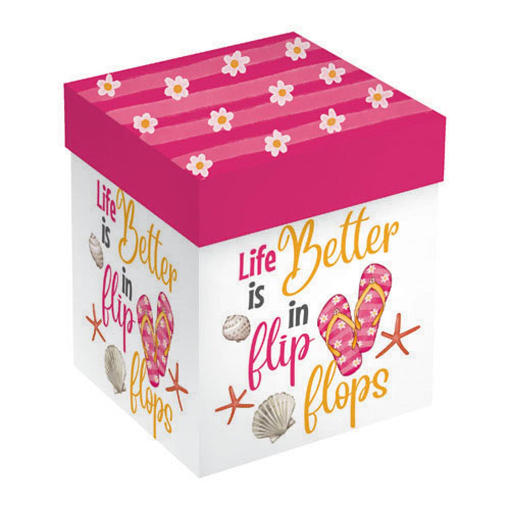 Celebrate summer, brighten any Happy Hour, and enjoy a glass of wine from this stemless wine glass. The colorful glass features a charming design with flip flops and reads "Life is better in flip flops." Holding up to 17 oz of your favorite wine or beverage and crafted from high-quality glass, this stemless glass should be hand washed to ensure longevity. Snatch this wine glass up for yourself or give it to a wine lover who lives in flip flops. It even comes in a coordinating decorative gift box, making it the perfect present!