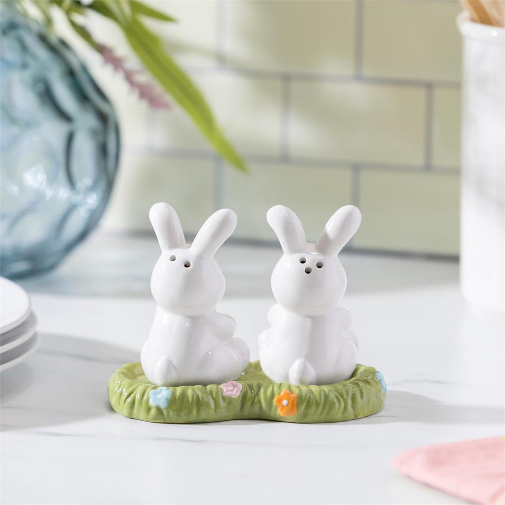 Add a touch of whimsy to your dining table with the Easter Bunny Scene Ceramic Salt and Pepper Set. These charming shakers feature two delightful bunnies, each sporting a colorful bow tie, perched on a grassy ceramic base. Perfect for Easter gatherings or springtime décor, this set is crafted from durable ceramic and designed to bring a festive, playful vibe to any meal. Measuring 3.0 inches in length, 5.5 inches in width, and 4.1 inches in height, these shakers are the ideal size for both functional use and decorative display.