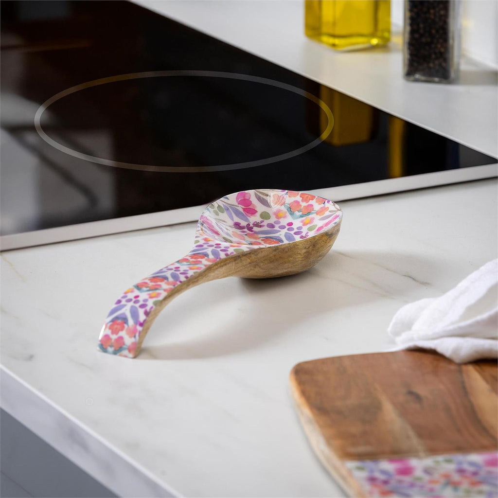 Elevate your kitchen aesthetics with the Petal Paradise Wood Spoon Rest. Measuring 10.25 inches in length, this spoon rest combines functionality with floral elegance. Made from durable wood, its vibrant floral pattern adds a touch of springtime charm to your countertop. Perfect for keeping your cooking area tidy, it accommodates spoons of various sizes while protecting surfaces from drips and stains. The gently curved design ensures stability and easy handling, making it a delightful addition to any culinary space.