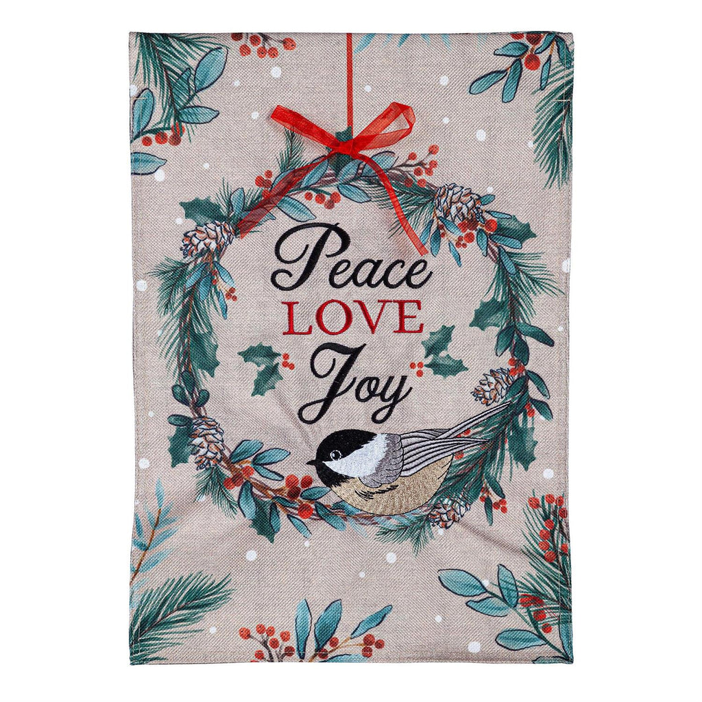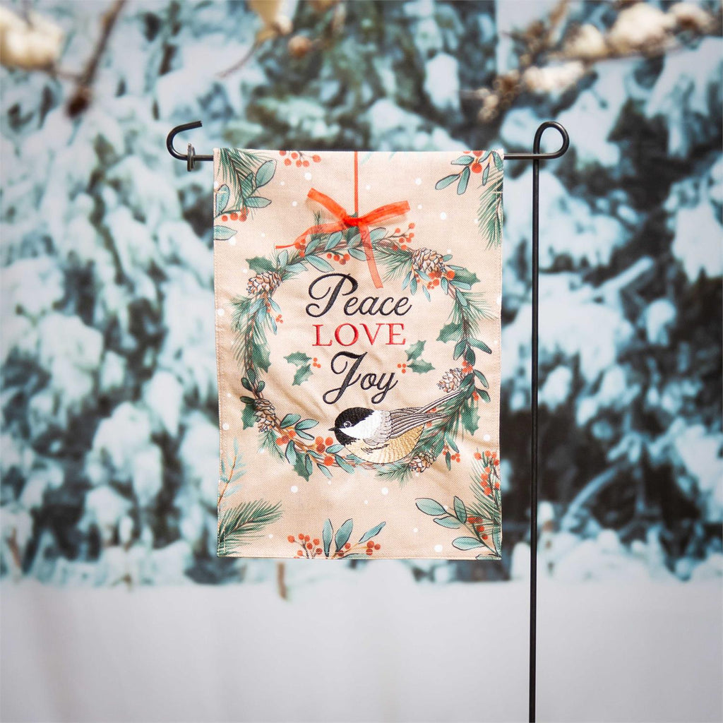 Spread holiday cheer all season long with this Chickadee Wreath Burlap Garden Flag. Boasting a festive color palette and detailed stitching, this flag will make any outdoor space stand out this holiday season. It has a sweet message that says, “Peace. Love. Joy.” to make every guest feel welcome as soon as they step through the door. Artwork is heat transferred onto both sides of the textured fabric to create a natural, crafted look. The poly-burlap is a durable and weatherproof material that will not fade or fray after continued display. This flag features a sleeve for use with any standard flagpole or stand, sold separately.