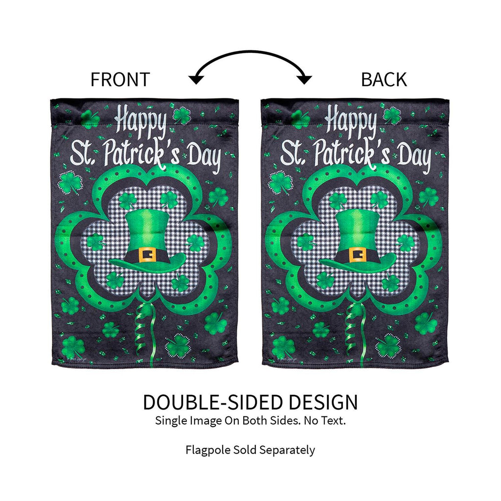 Celebrate St. Patrick's Day in festive style with this Welcome St. Pat's Lustre Garden Flag. Complete with bold shamrocks and a "Happy St. Patrick's Day" message, this flag is perfect for decorating any outdoor space. With the highest sheen on the market, our Lustre Flags shimmer in the sunlight to mesmerize everyone who sees them. Artwork is heat transferred onto both sides of the flag to guarantee the UV dyes are locked in. These two-sided designs use our sun-blocking technology to minimize fading and fraying, ensuring they remain vibrant and protected against the elements season after season.