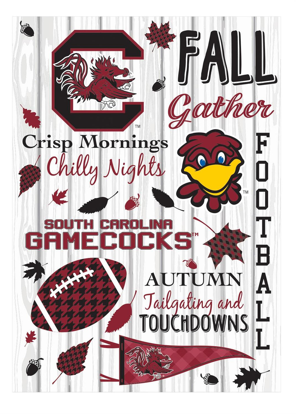 Celebrate the spirit of fall and your love for the University of South Carolina with this vibrant moire flag. Perfect for displaying in your garden or yard, this flag captures the essence of autumn with its rich colors and seasonal motifs. Measuring 12.5 inches wide by 18 inches high, it's the ideal size for adding a festive touch to your outdoor décor. The design features autumn leaves, football elements, and the iconic Gamecocks imagery, making it a must-have for any fan. Crafted for durability, it's designed to withstand the outdoor elements while showcasing your team pride.