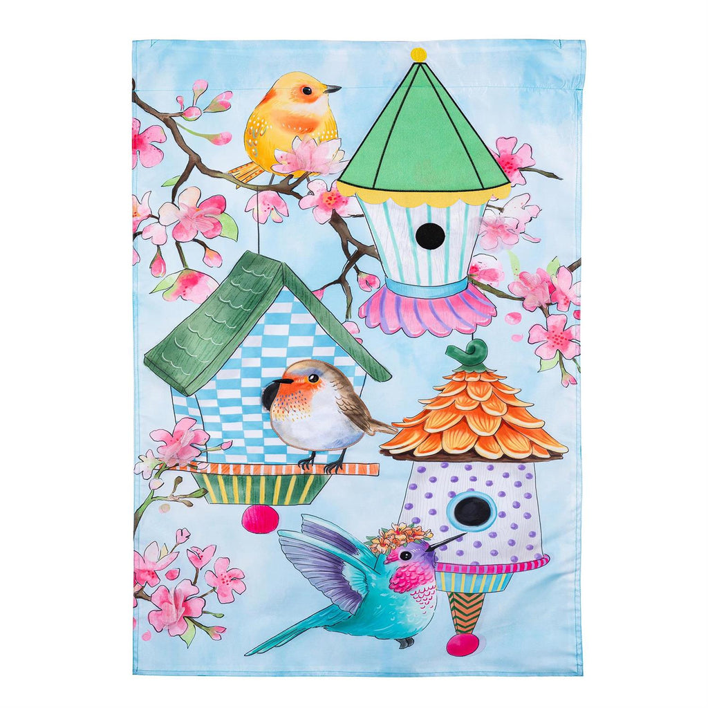 This charming flag adds an extra special touch to any home. It features a beautiful design of birds surrounded by cherry blossoms. Each Evergreen applique flag is carefully crafted from multiple layers of 310 denier nylon made from recycled plastic that can withstand a variety of weather conditions. We combine pieces of fade-resistant, strong fabric with tight, detailed stitching to create a dimensional mosaic effect. The soft yet heavyweight material illuminates beautifully in sunlight. Each flag features a sleeve that fits standard flagpoles or stands, sold separately. Due to the nature of the packaging, wrinkling may have occurred. Once item is unfolded and mounted on hardware, the creases will naturally fall out. Spot clean only. Never put in a dryer. When not in use, flags can be hung in a closet or placed in a storage container.