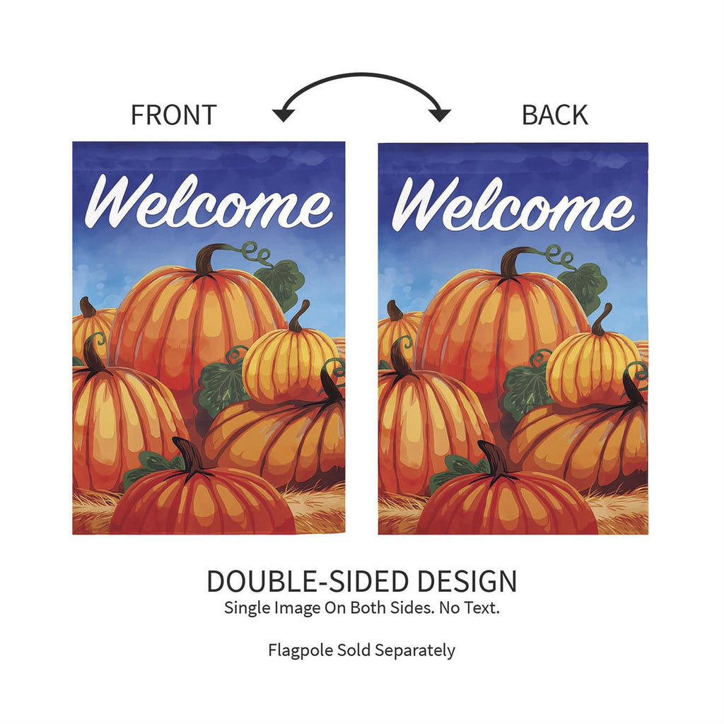 Celebrate the essence of autumn with the Welcome Pumpkin Patch Applique Garden Flag. This vibrant flag features a delightful design of pumpkins set against a rich blue background, welcoming guests with warmth and seasonal charm. Made to withstand the elements, its durable fabric ensures longevity through the fall seasons. Measuring 12.5 inches in width and 18 inches in height, it's the perfect size for any garden, porch, or yard. Add a touch of harvest spirit to your outdoor space with this eye-catching flag.