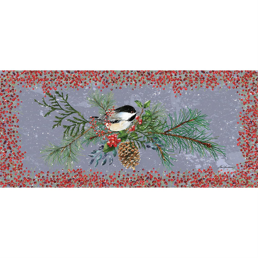 Welcome everyone to the home with this Sassafras switch mat. It features a sweet, feathered friend sitting on a branch of berries and pinecones. Bright red berries make a border around this adorable picture. Crafted from heat-sublimated polyester with a rubber backing, this versatile mat is designed to fit perfectly within Evergreen's switch doormat bases. The mildew resistant mat is ideal for indoor or outdoor use and features a skid-resistant backing to help keep it in place. This welcoming mat will freshen up your stoop season after season while ensuring your home stays debris-free. For stains, simply spot clean with soap and warm water.