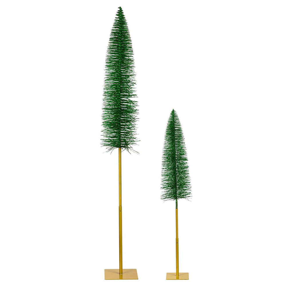 Enhance your holiday décor with this elegant Bottle Brush Tree with Glitter Set. Standing at an impressive height of 46 inches, these trees bring a touch of festive sparkle to any space. The trees feature a slender, conical shape with shimmering green bristles and sturdy gold bases, adding a stylish and contemporary look to your seasonal display. Perfect for mantels, tabletops, or as part of a larger decorative arrangement, these glittering trees will illuminate your home with holiday cheer.