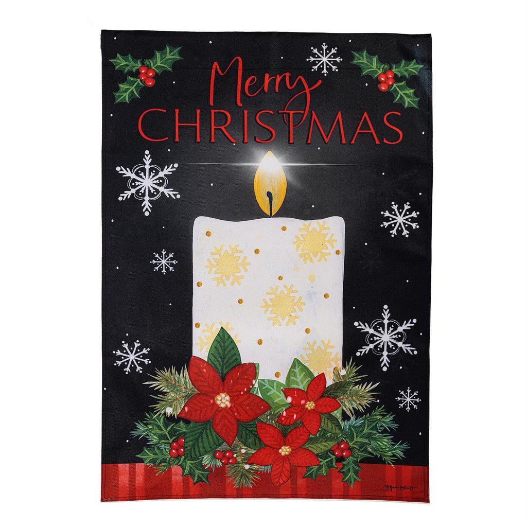 Illuminate your holiday spirit with the Merry Christmas Candle Burlap House Flag. This exquisite flag, measuring 28 x 44 inches, features a charming candle design surrounded by vibrant poinsettias and holly, set against a deep black background. Crafted from durable burlap, it’s perfect for adding a festive touch to your home exterior. The flag's rich colors and intricate details make it an eye-catching addition to your Christmas décor. Welcome guests with warmth and style this holiday season.