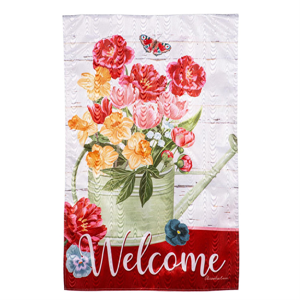 Create a warm welcome at home with our charming Floral Watering Can flag. It's a cheerful flag that's perfect for the season and beyond. These double-sided Moire flags deliver unmatched shimmer with a beautiful woodgrain effect that's readable on both sides and illuminates in sunlight. Enjoy all-weather features with heat transferred artwork, UV protected dyes, and sun-blocking material that offer brilliant color and non-fray durability. This flag features fabric made from recycled plastic; it will contribute to Evergreen’s efforts to save over 75 million plastic bottles from landfills each year (assumes an 18.6 oz. bottle). It's both beautiful and eco-friendly!