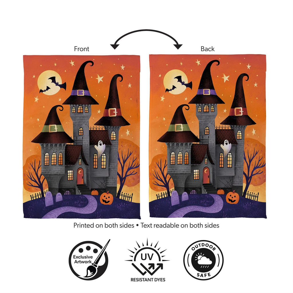 Welcome the spooky season with this Haunted House Nighttime Suede Flag. Perfectly sized at 12.5 x 18 inches, this flag features a charming haunted house scene with whimsical details like bats, ghosts, and jack-o'-lanterns, set against a vibrant orange night sky. Made from durable suede, it offers a soft texture and vibrant print, ensuring it stands out in your garden or yard. Ideal for Halloween decorating, this flag will add a playful yet eerie touch to your outdoor space.