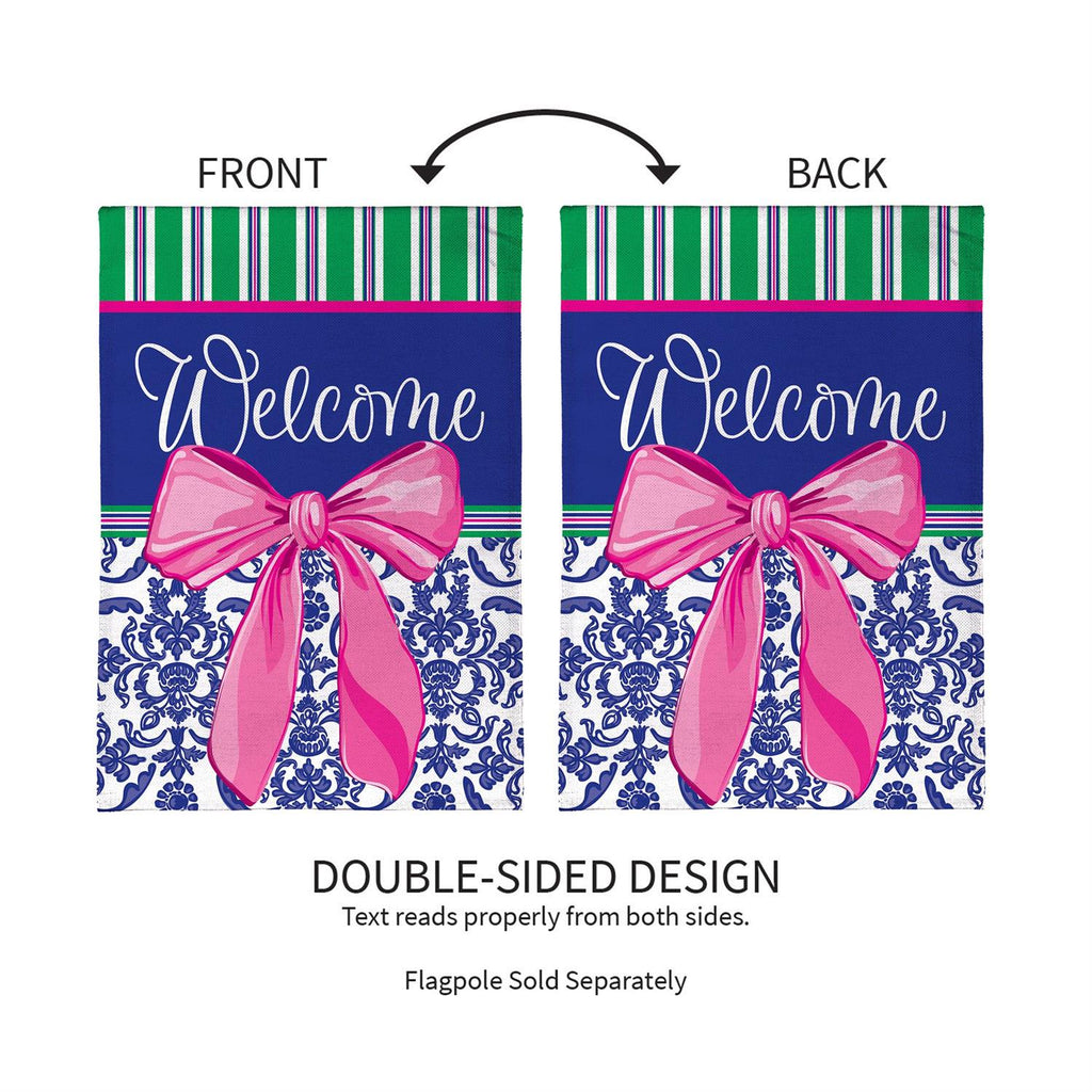 Enhance your home's curb appeal with the Welcome Bow Chinoiserie Burlap House Flag. This elegant flag showcases a vibrant pink bow against a rich blue background, adorned with a classic Chinoiserie pattern. Measuring 44 inches long by 28 inches wide, it’s designed to make a bold statement at your entryway. Crafted from durable burlap, it’s perfect for adding a welcoming touch throughout the seasons. Whether greeting guests or adding a decorative flair to your garden, this flag combines style and durability.