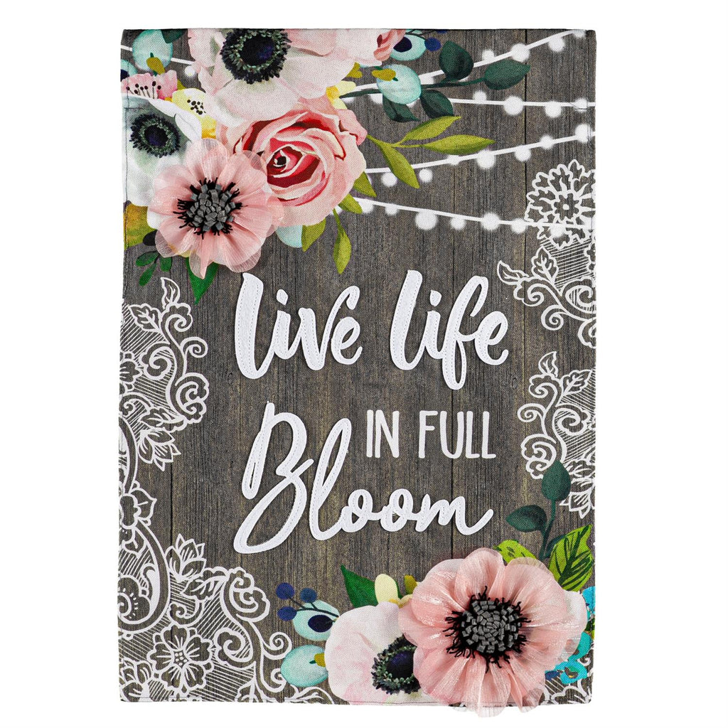 Enhance your garden with the Farmhouse Bloom Garden Linen Flag, a charming addition that embodies the spirit of nature and positivity. Measuring 12.5 inches in length and 18 inches in height, this flag is crafted from durable linen, perfect for outdoor use. Its vibrant floral design and inspirational message "Live Life in Full Bloom" make it a wonderful seasonal accent. Ideal for spring and summer, this flag adds a welcoming touch to any outdoor space, from gardens to patios.