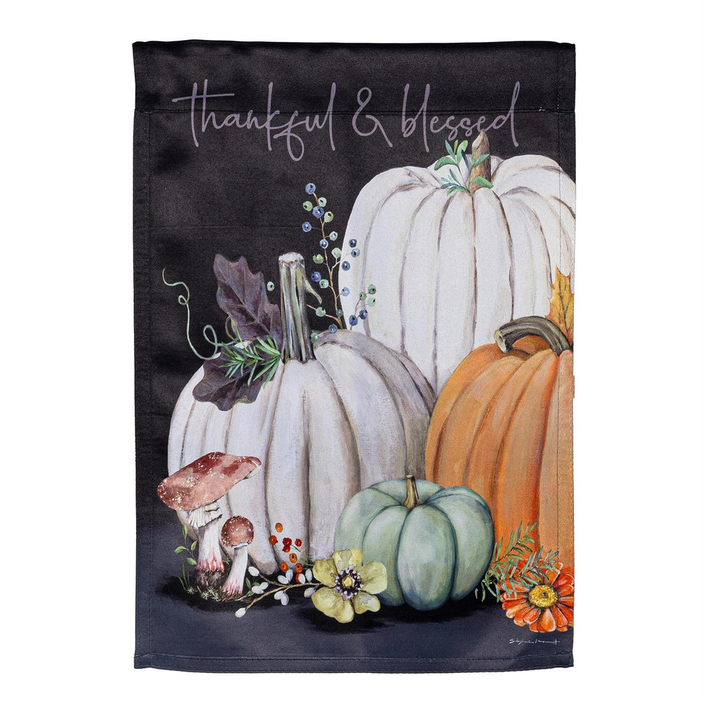 Celebrate the beauty of autumn with this exquisite suede garden flag. Featuring a charming arrangement of pumpkins and fall foliage, it's an ideal addition to your seasonal décor. Made from durable suede, this flag is designed to withstand the elements while maintaining its vibrant colors. Measuring 12.5 inches in width and 18 inches in height, it fits perfectly in your garden or front yard. Welcome guests with the warmth and gratitude of the season, as the 'thankful & blessed' message adds a heartfelt touch.