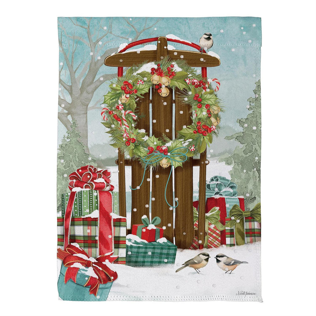 Celebrate the holiday season with this charming Christmas Sled Suede Garden Flag. Measuring 12.5 inches in width and 18 inches in height, it's the perfect addition to your outdoor décor. The flag features a beautifully illustrated wooden sled adorned with a festive wreath, surrounded by vibrant gift boxes and cheerful winter birds. Made from durable suede, it ensures vivid colors and long-lasting use, even in winter weather. Enhance your garden's festive spirit with this delightful seasonal accent.