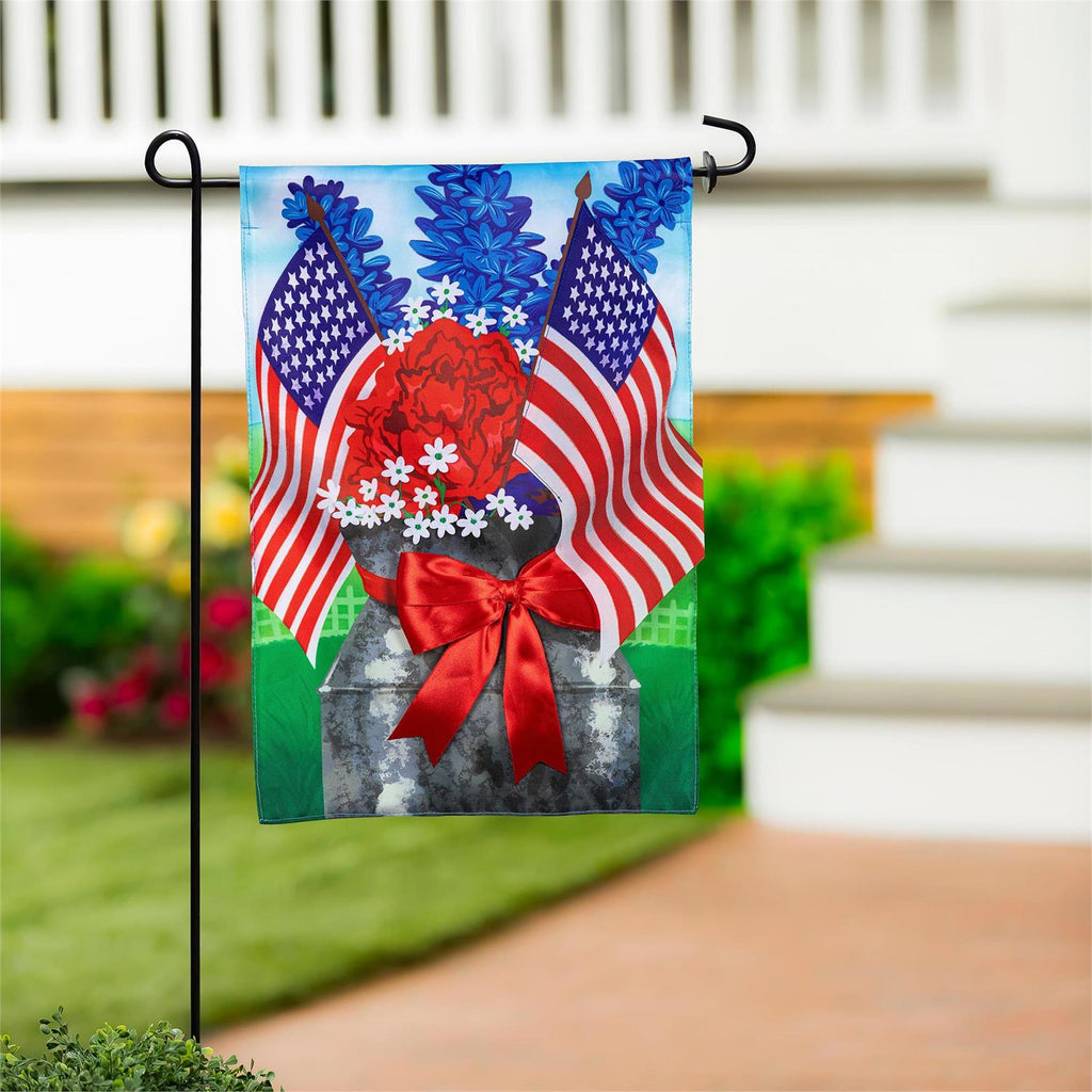 Celebrate your patriotism with this vibrant Patriotic Bouquet Applique Garden Flag. Featuring beautiful red, white, and blue floral designs alongside American flags, this flag is perfect for showcasing your national pride. Made from durable materials, it stands up to the elements, ensuring long-lasting charm in your garden or yard. The vivid colors and detailed applique work make it a standout piece for any patriotic holiday or everyday display. Easy to install and a delightful addition to your outdoor décor.