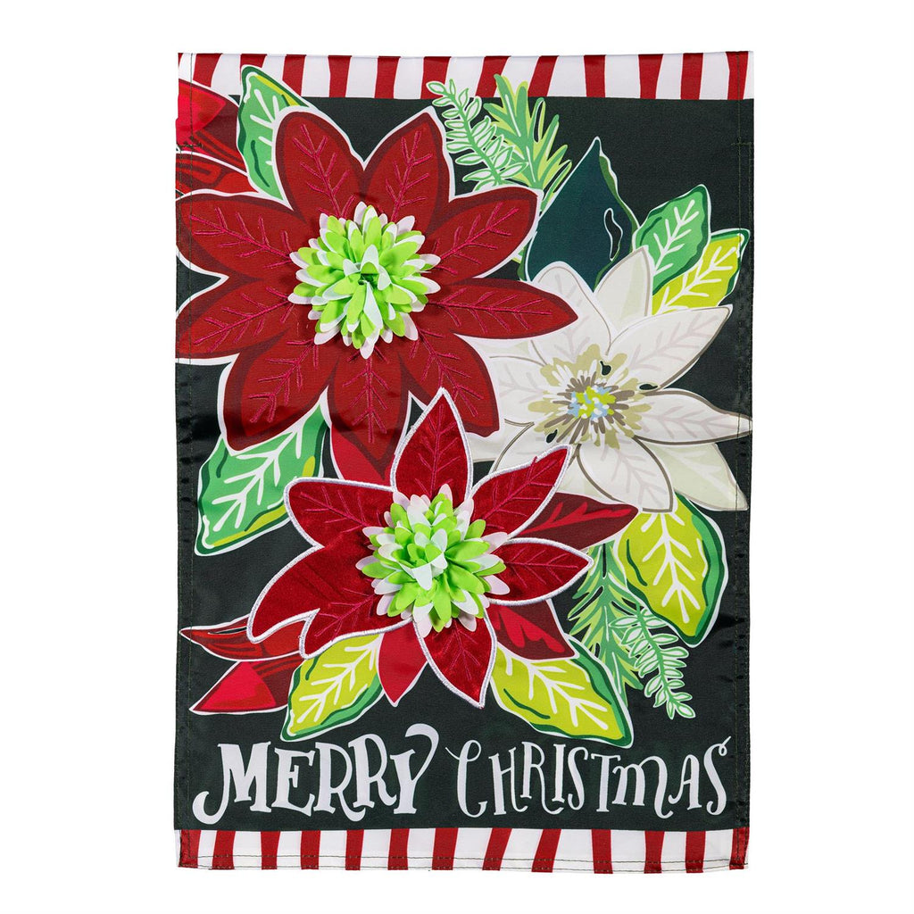 Add festive cheer to your outdoor space with the Holiday Poinsettia Applique Garden Flag. This eye-catching flag features vibrant red and white poinsettias along with lush green leaves, creating a classic holiday look. The applique design adds depth and texture, making it a standout piece for your garden. Crafted from durable materials, this flag is designed to withstand the winter elements while maintaining its bright colors. Measuring 18 inches in length and 12.5 inches in width, it's the perfect size to make a statement without overwhelming your space.