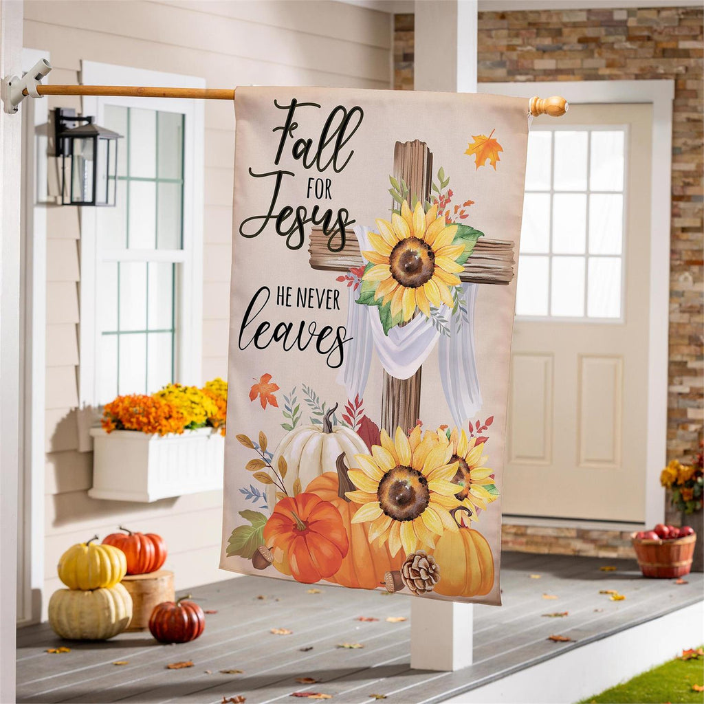 Embrace the season with the 'He Will Never Leave' Suede House Flag, a beautiful addition to your fall decor. Measuring 29 x 43 inches, this flag features vibrant autumn imagery with sunflowers and pumpkins, delivering a heartfelt message of faith and comfort. Made from durable suede, it offers a soft texture and rich colors that resist fading. Perfect for your garden or porch, this flag brings warmth and inspiration to any outdoor space.