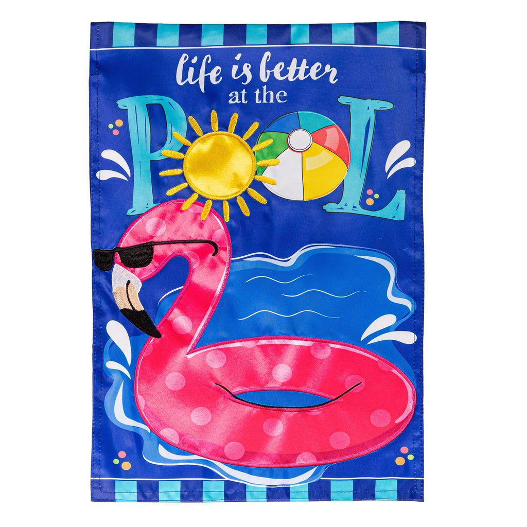 Bring a splash of fun to your outdoor space with the 'Life is Better at the Pool' Applique House Flag. This vibrant flag features a playful flamingo floatie and colorful beach ball design, perfect for adding a touch of summer to your home. Made from durable materials, it withstands the elements while maintaining its bright and cheerful appearance. The applique style adds texture and dimension, making it a standout piece in your garden or patio. Sized at 44 x 28 inches, it's ideal for welcoming guests with a warm, poolside vibe.