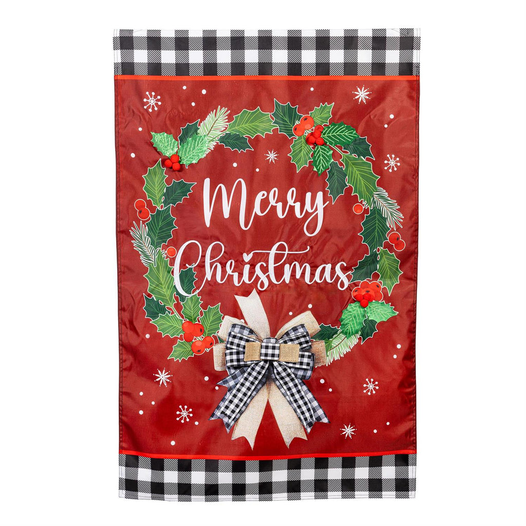 Celebrate the holiday season with this charming Merry Christmas Wreath Applique House Flag. Featuring a festive wreath design, this flag is crafted from durable, weather-resistant material to withstand winter conditions. The classic red background is beautifully accented with a black and white checkered border, adding a touch of elegance to your outdoor decor. Measuring 28 inches in width and 44 inches in height, it’s the perfect size to make a statement on your porch or garden. Whether you're welcoming guests or simply spreading holiday cheer, this flag is a delightful addition to your seasonal decorations.